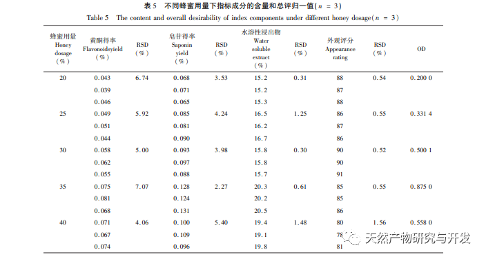 Huangqi styrker immunforsvaret, virker antibakterielt og virushæmmende, genopbygger qi og stabiliserer overfladen, virker vanddrivende og afgiftende. Mihuangqi kan gøre Huangqis medicinske egenskaber mere skånsomme, give næring til qi og blod, opvarme lungerne og fremme diurese. 2020-udgaven af den kinesiske farmakopé bruger Astragaloside IV i Astragalosides og Flavonoids i Astragalus membranaceus som kvalitetskontrolindikatorer for Astragalus membranaceus medicinske materialer og ristet Astragalus membranaceus. Et stort antal litteraturer rapporterer, at den qi-styrkende effekt af Astragalus membranaceus hovedsageligt er afhængig af saponiner og flavonoider. Derfor bruger denne artikel astragalosid og flavonoider som indholdsindikatorer for den optimale honningristede Astragalus membranaceus-forarbejdningsteknologi, som er mere omfattende. Samtidig tilføjede dette eksperiment også vandopløselige ekstrakter og scoringsindikatorer for udseende for omfattende at kontrollere kvaliteten af Astragalus membranaceus.