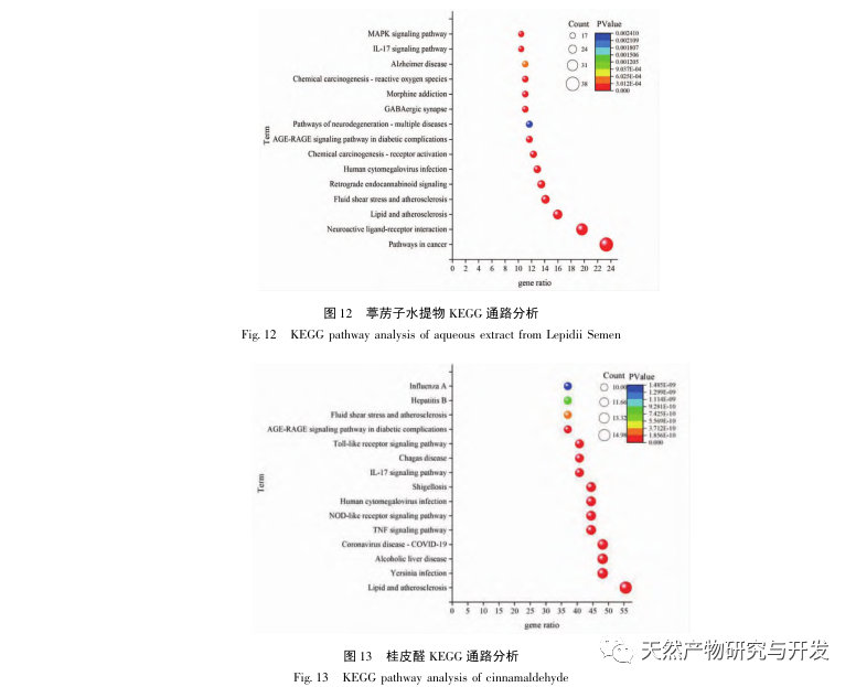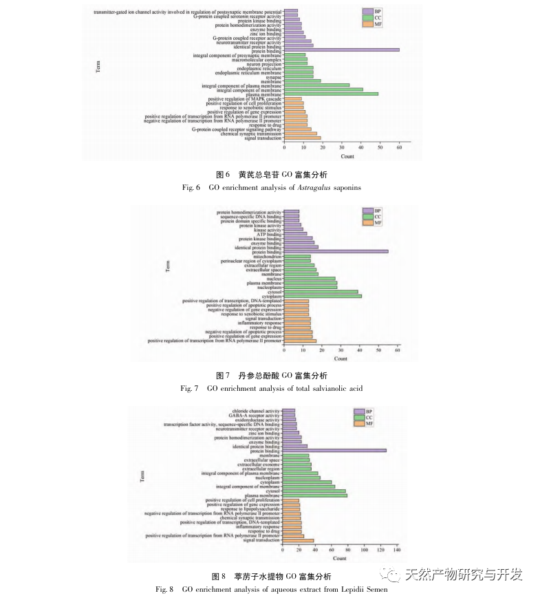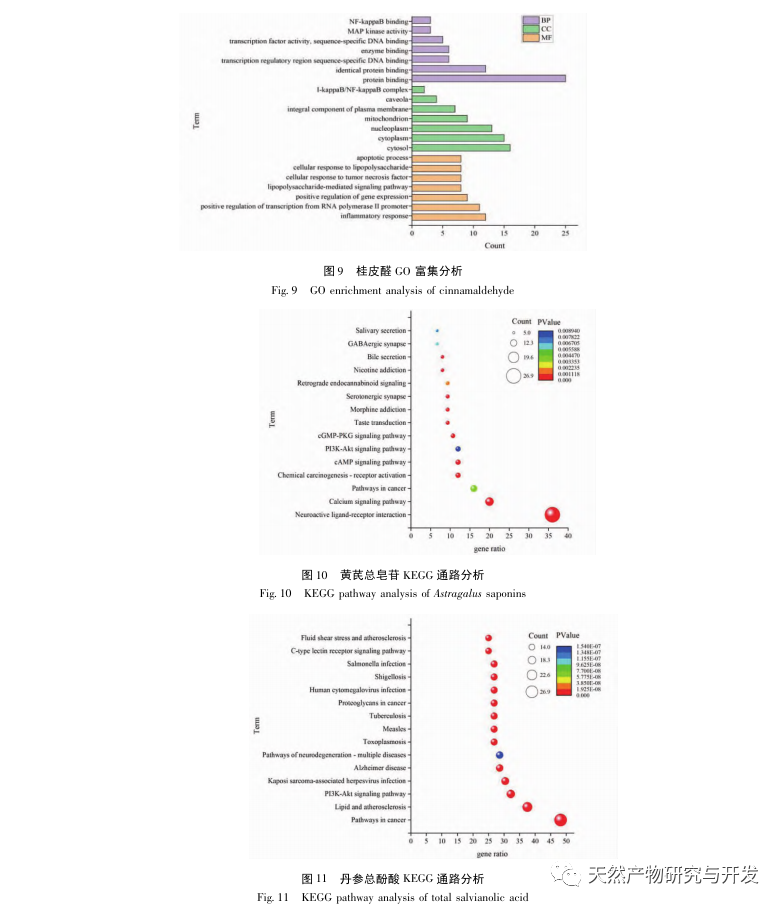 Huangqis samlede saponiner er hovedsageligt beriget i calciumsignalvejen, cGMPPKG, PI3K Akt, cAMP-signalvejen osv. Tidligere eksperimenter har vist, at totale saponiner af Astragalus membranaceus kan lindre oxidativ stress i rotte myokardium, hæmme kardiomyocytapoptose og forbedre hjertefunktionen ved at regulere AKL / p38MAPK-vejen. Huangqi IV-glykosid kan hæmme blodpladeaggregering og spille en rolle i forebyggelsen af vaskulær restenose, hvilket yderligere tyder på, at det traditionelle kinesiske medicinprincip om "qi-cirkulation fører til blodcirkulation" er rimeligt. Danshens samlede phenolsyrer er hovedsageligt beriget i PI3K Akt-signalvejen, og undersøgelser har vist, at Danshen phenolic acid A lindrer lipopolysaccharid-induceret apoptose og oxidativ stress i H9c2-kardiomyocytter ved at aktivere AKT/mTOR/4EBP1-vejen. Vandekstraktet af Scutellaria baicalensis er beriget i MAPK-signalvejen, calciumsignalvejen osv. Undersøgelser har vist, at Scutellaria baicalensis-ekstrakt kan aktivere MAPK-signalvejen, hæmme celleapoptose og beskytte mod myokardieskade. Cinnamaldehyd er beriget med Toll-lignende receptorer, TNF-signalveje osv. Cinnamaldehyd kan reducere ROS-indholdet i myokardievæv, lindre myokardiecelle-autofagi og beskytte myokardiet, hvilket delvist bekræfter netværksforudsigelsesresultaterne i denne undersøgelse.