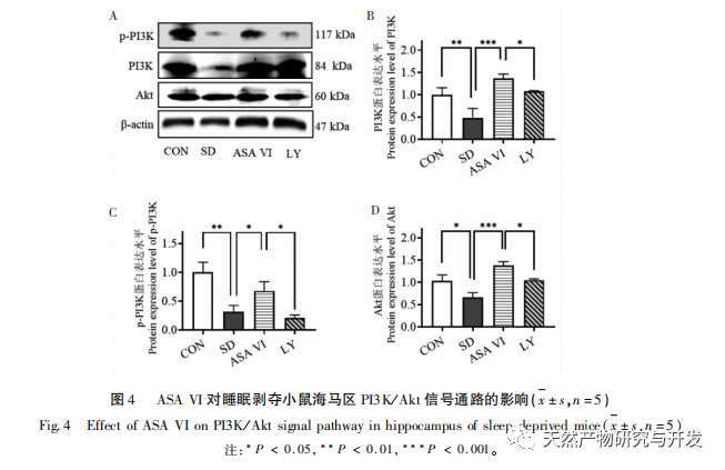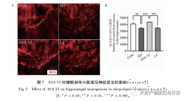 Neurogenesen i den voksne hippocampus spiller en vigtig rolle i hjernens plasticitet og vedligeholdelse af neurale netværk, og funktionsforstyrrelser kan føre til forskellige menneskelige sygdomme, herunder depression, angst, kognitiv svækkelse og neurodegenerative sygdomme. Når der opstår betændelse i hjernen, overaktiveres de vigtigste neuroimmunceller i hjernen - mikroglia - og frigiver inflammatoriske mediatorer og neurotoksiske molekyler, der i høj grad hæmmer neurogenesen i den voksne hippocampus, hvilket fører til en øget risiko for følelsesmæssige forstyrrelser og kognitiv dysfunktion. De nydannede neuroner i gnavernes hippocampus kommer hovedsageligt fra det subgranulære område (SGZ) i gyrus dentatus, som spiller en vigtig rolle i dannelsen og konsolideringen af hukommelsen. Forskning har vist, at neuroinflammatoriske molekyler, der frigives af mikroglia, kan påvirke neurogenesen i den voksne hippocampus ved at hæmme PI3K/Akt-signalvejen. Denne undersøgelse viste, at PI3K/Akt-signalvejen og antallet af nye neuroner i hippocampus hos søvnberøvede mus var signifikant hæmmet. ASA VI-intervention aktiverede PI3K/Akt-signalvejen i hippocampus hos søvnberøvede mus og fremmede neurogenese i den voksne hippocampus. Efter blokering af PI3K/Akt-signalvejen med LY294002 faldt antallet af nyligt genererede neuroner i hippocampus betydeligt, og forbedringseffekten af ASA VI på kognitiv funktion hos søvnberøvede mus blev afskaffet af LY294002. Liu et al. rapporterede, at ASA VI kan fremme spredning og overlevelse af neurale stamceller ved at aktivere PI3K/AKT-vejen og fremme deres differentiering til neuroner, beskytte neurale stamceller mod virkningerne af neuroinflammation og derved forbedre hippocampal neurogenese, depressionslignende adfærd, angstlignende adfærd og kognitiv dysfunktion hos mus med kronisk neuroinflammation. Disse resultater indikerer, at den forbedrende effekt af ASA VI på den kognitive funktion hos mus med søvnmangel afhænger af den PI3K/Akt-signalering, der medierer den neurogene vej.