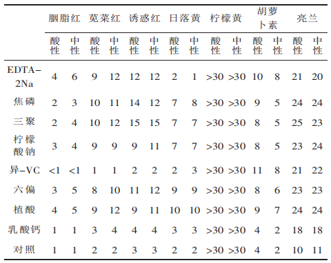 Farvebeskyttelsestestene af farvebeskyttelsesadditiver som natriumcitrat, natriumtripolyfosfat, natriumpyrofosfat, natriumhexametafosfat, EDTA-2Na, fytinsyre, natriumisoascorbat, calciumlaktat på pigmenter som karmin, amarantinerød, fristelsesrød, citrongul, solnedgangsgul, lyseblå, β-caroten og så videre blev udført, og resultaterne er vist i tabel 1.