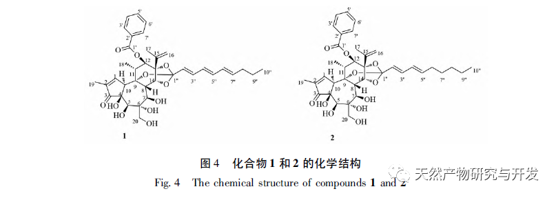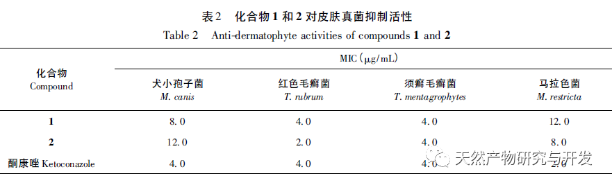 Hudsvampesygdomme er en global infektionssygdom, og de fugtige og varme regioner i det sydlige Kina som Guangdong, Hainan, Fujian og Hong Kong er højrisikoområder for hudsvampesygdomme. Kina har rigelige ressourcer af traditionel kinesisk medicin, og det er nødvendigt at søge efter og udvikle nye antifungale aktive stoffer eller lægemidler fra kinesiske medicinske materialer. Denne undersøgelse brugte kromatografiske separationsteknikker og metoder til identifikation af naturproduktstrukturer til at isolere og identificere to diterpenoidforbindelser af naringenintypen fra blomsterknopperne af Daphne genkwa, som har evnen til at behandle fnat og alopecia. En af dem er en ny forbindelse; Forbindelsens hæmmende aktivitet mod Microsporum canis, Trichophyton rubrum, Trichophyton rubrum og Malassezia blev bestemt ved hjælp af MIC-metoden. Det viste sig, at forbindelserne 1 og 2 udviste stærk hæmmende aktivitet mod Trichophyton rubrum og Trichophyton rubrum. Denne artikel beriger yderligere den kemiske sammensætning af yuanhua-blomsterknopper og opdager deres in vitro-svampeaktivitet og akkumulerer grundlæggende data til ekstern anvendelse og udvikling af yuanhua-blomsterknopper.