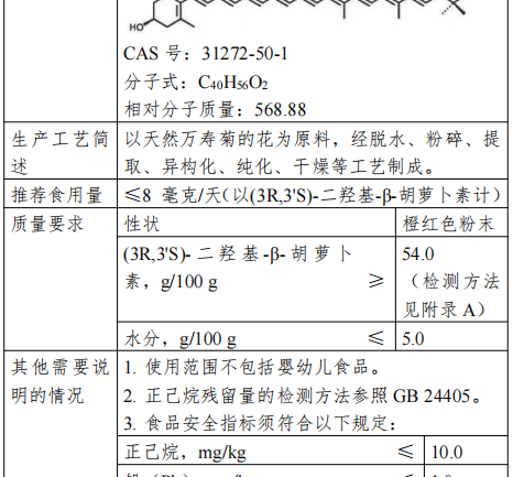 Den anbefalede portionsstørrelse for dette produkt er ≤ 8 mg/dag (som (3R,3'S)-dihydroxy-beta-caroten), og indholdet på 54,0-100,0 g/100 g omregnes i henhold til det faktiske indhold. Anvendelsesområdet for (3R,3'S)-dihydroxy-beta-caroten omfatter ikke fødevarer til spædbørn og småbørn.