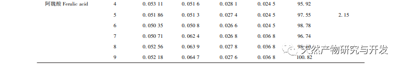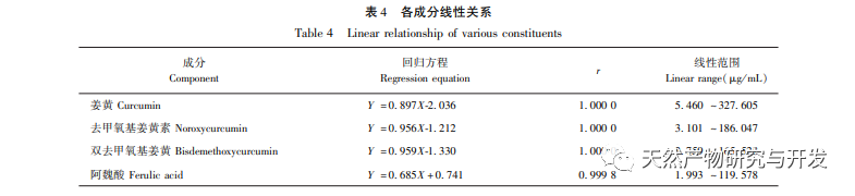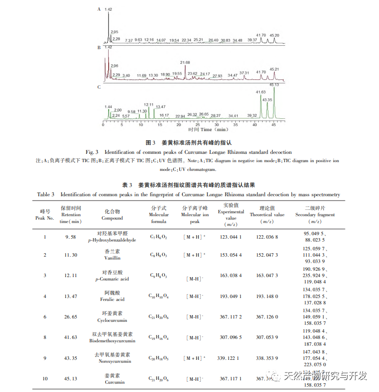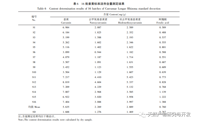 Udvælgelse af måleindikatorer. Curcumin og flygtig olie er en af de vigtigste aktive komponenter i gurkemeje, men deres vandopløselighed er relativt lav. Standardafkog bruger vand som opløsningsmiddel, og vandopløselige komponenter bør være et vigtigt materialegrundlag for effektiviteten af afkog. Derfor blev der i undersøgelsen af kvalitetsstandarder for standardafkog ud over måling af gurkemejekomponenter også tilføjet bestemmelse af ferulinsyre. Sammenlignet med curcuminkomponenter har ferulinsyre relativt god vandopløselighed og er en forløber for syntesen af curcuminkomponenter. Samtidig kan curcuminkomponenter under afkogningsprocessen af standardafkog også omdannes til ferulinsyre. Moderne farmakologisk forskning har bekræftet, at ferulinsyre har antibakterielle, antivirale, antioxidante, antitrombotiske, lipidsænkende, reducerende myokardieiskæmi og iltforbrugseffekter, og dens medicinske værdi bliver stadig vigtigere. Der lægges vægt på mængden af ferulinsyre i standardafkoget, hvilket afspejler ændringerne i den kemiske sammensætning af gurkemeje under standardafkogsprocessen. Optimering af produktionsprocesser for moderne traditionelle kinesiske medicinformuleringer som f.eks. granulat baseret på "standardafkog" har stor vejledende betydning.