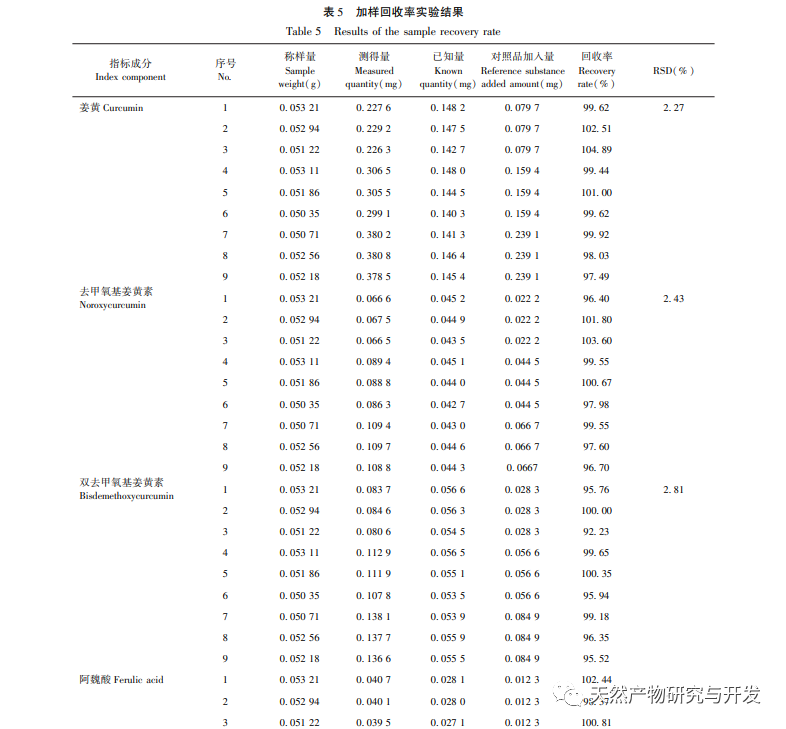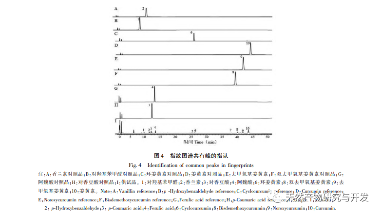 Etablering af analysemetoder. Polariteten af kemiske komponenter i standardafkog af gurkemeje varierer meget, herunder aktive ingredienser som curcumin med høj lipidopløselighed og vandopløselige ingredienser som ferulinsyre. Derfor kræver etableringen af fingeraftryksspektret maksimal ekstraktion af ovennævnte komponenter, samtidig med at man overvejer den gode kromatografiske adskillelse af kemiske komponenter med forskellige polariteter og etablerer en kvantitativ metode med flere komponenter, der er i overensstemmelse med betingelserne for fingeraftryksspektret. Derfor gennemførte vi en systematisk undersøgelse af mobilfasesystemet, detektionsbølgelængden og forberedelsesmetoden for testopløsningen for at bestemme de optimale kromatografiske forhold og forberedelsesmetoden for testopløsningen.
