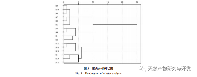 Evaluering af fingeraftryksspektre og resultater af indholdsbestemmelse. Ligheden mellem fingeraftryksspektrene fra 16 partier gurkemeje-standardafkog og kontrolfingeraftryksspektrene er over 0,95, hvilket indikerer, at den overordnede lighed mellem fingeraftryksspektrene er høj og kan bruges til identifikation og kvalitetskontrol af gurkemeje-standardafkog. Beregning af lighed kan afspejle den stabile sammensætning og de karakteristiske forhold mellem fingeraftrykstoppe, men den kan ikke fuldt ud beskrive og skelne mellem fordelingsmønstre og interaktionsforhold mellem komplekse komponenter i fingeraftryksspektret. Derfor blev der brugt mønstergenkendelsesmetoder inden for kemometri til at undersøge fingeraftryksspektret. Resultaterne viste, at 16 partier af gurkemeje-standardafkogsprøver havde en vis produktivitet med 10 fælles topområder som variabler, HCA og PCA klassificerede begge 16 partier af prøver i to kategorier, hvor prøver fra Sichuan-produktionsområdet blev klassificeret i en kategori, og prøver fra Yunnan-produktionsområdet blev klassificeret i en anden kategori. Der blev fundet i alt 6 differentierede biomarkører, nemlig peak, peak (ferulinsyre), peak 8 (bis(demethoxycurcumin)), peak 9 (demethoxycurcumin), peak 2 (vanillin) og peak 1 (p-hydroxybenzaldehyd). Peak 5 blev identificeret ved hjælp af massespektrometri med høj opløsning, og det antages, at det kan være 1-(4-hydroxy-3,5-dimethoxyphenyl)-7-(4-hydroxy-3-methoxyphenyl)-1,4,6-heptadien-3-on. I øjeblikket er der mangel på referencestandarder, og der er behov for yderligere forskning og bekræftelse. Ved at måle indholdet af ferulinsyre, demethoxycurcumin, demethoxycurcumin og curcumin viste resultaterne, at standardafkoget af curcumin, demethoxycurcumin, dobbelt demethoxycurcumin og ferulinsyre fremstillet af gurkemejeråvarer i Dali, Yunnan, var højere end indholdet i prøver fra Yibin og Leshan, Sichuan. Dette giver også en reference til udvælgelse af råvarer til virksomhedsproduktion.