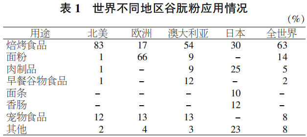 Kinas samlede årlige produktion af hvede på mere end 100 millioner tons, glutenforarbejdningsråvarer er tilstrækkelige med åbenlyse forarbejdnings- og anvendelsesfordele. Ifølge statistikker er den globale årlige produktion af gluten omkring 600.000, Kina er omkring 100.000 t. Gluten i Nordamerika, Europa, Australien, Japan og andre lande har en bred vifte af applikationer i forskellige brancher (tabel 1). Med den stigende produktion af gluten og den ændrede tendens til diversificering af markedets efterspørgsel er den dybe udvikling og udnyttelse af gluten særlig vigtig.