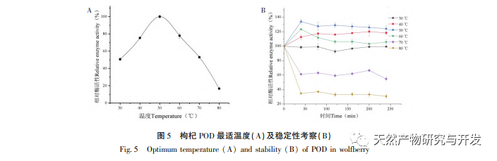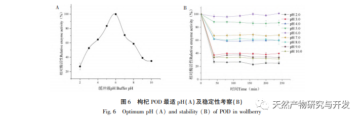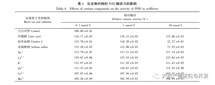Forskning i POD's enzymatiske egenskaber har vist, at temperatur og pH er vigtige faktorer, der påvirker enzymaktiviteten. Den optimale temperatur og pH for POD er henholdsvis 50 °C og 6,0. Efter at være blevet behandlet med POD i pH-området 4,0-8,0 i 4 timer forblev enzymaktiviteten over 60%. Efter at være blevet behandlet ved en temperatur på 30-60 °C i 4 timer forblev pH-enzymaktiviteten omkring 60%, hvilket indikerer, at gojibær-POD er et syre- og alkaliresistent og stabilt enzym. Forskning har vist, at metalioner som Na+, Ca2+, K2+, Zn2+, Cu2+ samt inhibitoren citronsyre har en vis aktiverende effekt på POD. Blandt dem har Ca2+ den mest markante aktiverende effekt på POD, hvilket tyder på, at kontakt med Ca2+ bør undgås under opbevaring og forarbejdning af gojibær. Ascorbinsyre og natriumsulfit har en betydelig hæmmende effekt på enzymet, hvor ascorbinsyre har en bedre hæmmende effekt, hvilket indikerer, at ascorbinsyre effektivt kan hæmme aktiviteten af wolfberry Ca-enzymet.