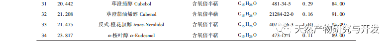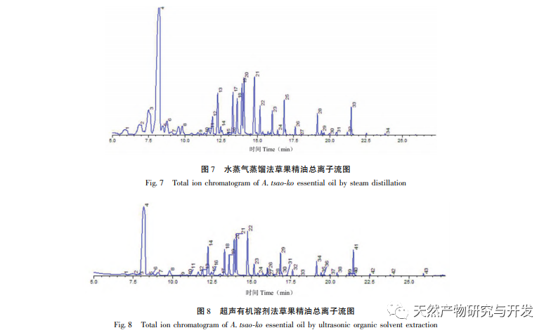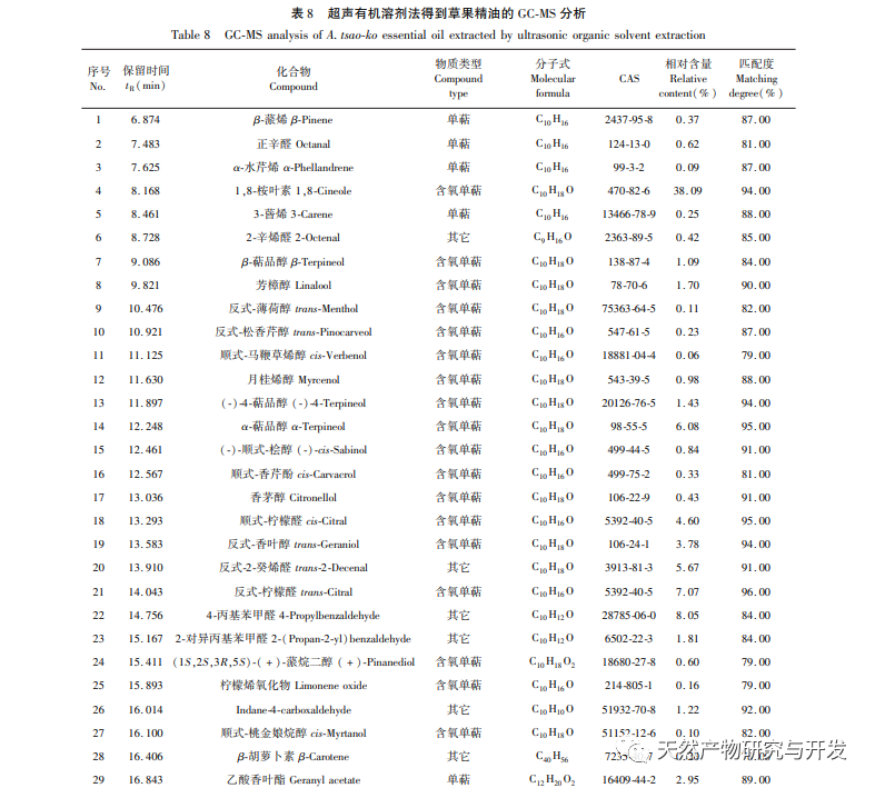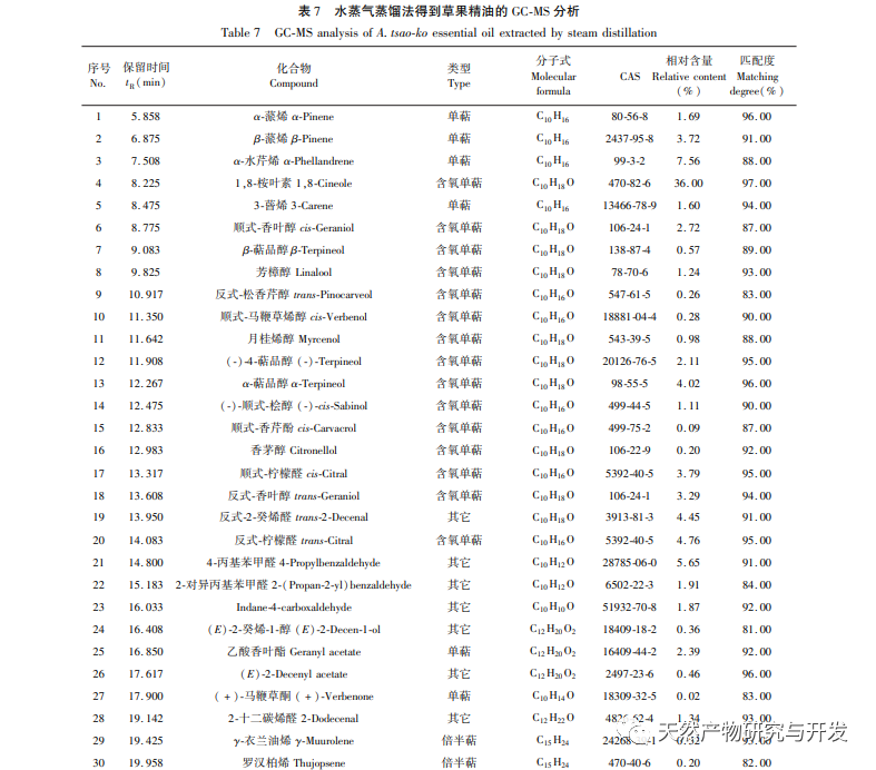 Komponenterne i æterisk olie af græsfrugter udvundet ved dampdestillation og ultralydsmetode med organisk opløsningsmiddel blev identificeret og sammenlignet med GC-MS med henholdsvis 34 og 43 typer. Blandt dem viste det sig, at 1,8-eukalyptol havde et højere indhold, såvel som α-carvacen, 4-propylbenzaldehyd, transcitral, trans-2-decenal, α-terpineol, cis-citral, β-pinen, transgeraniol, cis-geraniol, acetatgeraniol, (-) -4-terpineol osv. Hovedkomponenten, 1,8-eucalyptol, kan være et vigtigt grundlag for dets farmakologiske virkninger som f.eks. antibakterielle, antitumorale og antivirale virkninger. Den har et højt indhold af æterisk olie fra græsfrugter og har et stort udviklingspotentiale. Forskning har vist, at æterisk olie fra græsfrugter kan interagere med SARS-CoV-2 spike-protein RBD i aerosoler, blokere interaktionen mellem RBD og hACE2, hæmme deres binding til receptorer, afskære transmissionsveje og have et stort potentiale i at blokere virus-aerosoltransmission. Denne undersøgelse kan give nye ideer til den videre udvikling og udnyttelse af æterisk olie fra græsfrugter, fremme dens anvendelsesinnovation og udvide dens vej mod modernisering af traditionel kinesisk medicin.