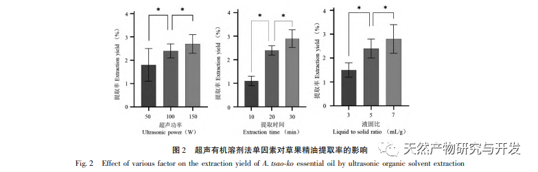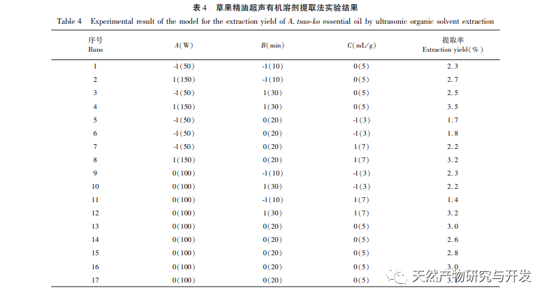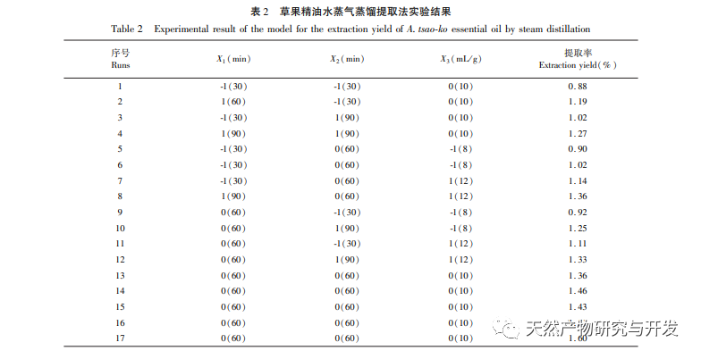 I denne undersøgelse blev der anvendt dampdestillation og ultralydsmetode med organisk opløsningsmiddel til at udvinde æteriske olier fra græsfrugter. I dette eksperiment blev den æteriske olieekstraktor, der blev brugt til at udvinde æteriske olier fra græsfrugter ved dampdestillation, forbedret for at sænke temperaturen i den kondenserende del under udvindingsprocessen. Ved at udføre enkeltfaktoreksperimenter, optimere udvindingsbetingelserne ved hjælp af RSM og BP-ANN og sammenligne de optimerede modeller blev de optimale procesparametre opnået for at give datastøtte til effektiv udvinding og præcis anvendelse af æterisk olie fra græsfrugter; Ved at analysere sammensætningen af æterisk olie i Caoguo ved hjælp af gaskromatografi-massespektrometri (GC-MS), udforske dens farmakologiske stofgrundlag og fremme den moderne anvendelse af traditionel kinesisk medicin Caoguo.