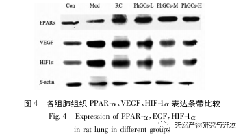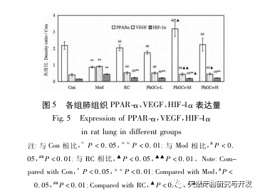 Derefter fokuserede vi på at observere virkningerne af PhGC'er på HIF-1 α, VEGF og PPAR - α i den hypoxiinducerede vej. Ekspressionen af mRNA og protein i rotternes lungevæv i hver gruppe blev påvist ved hjælp af immunhistokemi, fluorescens-kvantitativ PCR og Western blot-metoder. Immunhistokemiske resultater viste, at ekspressionsniveauet af VEGF i lungearterierne hos Mod-rotter var højere end hos Con, mens ekspressionsniveauet af PPAR-α var lavere end hos Con. Ekspressionsniveauet af VEGF i lungearterierne hos PhGCs low, medium, PhGCs-H og RC-grupper var lavere end hos Mod, mens ekspressionsniveauet af PPAR - α steg. Dette indikerer, at PhGC'er og Rhodiola rosea kan hæmme udtrykket af VEGF induceret af hypoxi, fremme PPAR - α-ekspression og lindre pulmonal vaskulær proliferation og myogenese og dermed spille en terapeutisk rolle i CMS. Gennem eksperimentel måling af udtrykket af HIF-1 α-protein og mRNA i lungevæv blev det konstateret, at udtrykket af HIF-1 α-protein i lungevævet hos CMS-modelrotter steg markant, mens udtrykket af mRNA og Con ikke viste nogen forskel. Dette er i overensstemmelse med de relevante forskningsresultater, der viser, at hypoxi hovedsageligt regulerer udtrykket af HIF-1 α-protein. PhGC'er kan reducere ekspressionsniveauerne af HIF-1 α-protein og mRNA betydeligt, hvilket indikerer, at de kan have en indvirkning på transkriptionen og translationen af HIF-1 α. Rhodiola rosea havde dog ingen signifikant effekt på ekspressionen af HIF-1 α-mRNA, hvilket indikerer, at det hovedsageligt påvirker proteinekspressionen ligesom hypoxi.