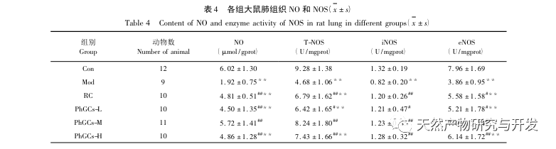 NO, som en endotelafhængig vasodilatator, spiller en vigtig rolle i endotelvasodilatation, fordi den direkte afslapper pulmonal vaskulær glat muskulatur, hvilket resulterer i betydelig pulmonal vasodilatation. Det har også evnen til at hæmme spredning og migration af glatte muskelceller i lungekarrene, undertrykke blodpladeaggregering og spiller en vigtig rolle i opretholdelsen af lungecirkulationens stabilitet. Denne undersøgelse viste, at NO-indholdet i Mod-lungevævshomogenat faldt, og at aktiviteterne i T-NOS, iNOS og eNOS faldt. PhGC'er kan øge NO-indholdet i lungevæv ved at forbedre aktiviteterne i TNOS, iNOS og eNOS, hvilket spiller en rolle i bekæmpelsen af spredning og myometrisering af glatte muskler i lungearterien og behandling af CMS.