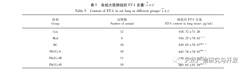 ET-1 er den stærkeste vasokonstriktor, der hidtil er opdaget, og hypoxi kan øge niveauet af ET-1 i blodet betydeligt. Rajput et al. sammenlignede forskellene i ET-1-alleler mellem beboere i store højder og almindelige beboere og fandt, at visse alleler af ET-1 blev overudtrykt hos beboere i store højder, og udtrykket af ET-l-allelen var signifikant korreleret med ET-1-niveauer i plasma. I denne artikel steg indholdet af ET-1 i lungevævet hos Mod-rotter betydeligt, hvilket indikerer, at hypoxi inducerede øget udskillelse af ET-1 i lungevæv, hvilket stemmer overens med andre undersøgelser. Administration af PhGC'er kan reducere indholdet af ET-1 i lungevævet hos CMS-rotter, hvilket indikerer, at PhGC'er kan hæmme vaskulær indsnævring induceret af ET-1, reducere trykket i lungearterien og udøve terapeutiske virkninger på CMS.