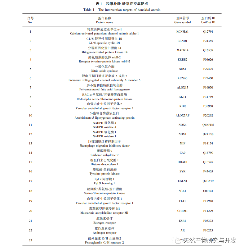 Aktivering af udtrykket af HIF-1 α kan fremme angiogenese, neurobeskyttelse og neural reparation og derved behandle cerebrale iskæmiske rotter. Derudover er HIF-1 også en nøglefaktor til regulering af tumorangiogenese, og magnolol hæmmer udtrykket af HIF-vej og hypoxi-medierede proangiogene gener i de fleste tumorer og iskæmiske sygdomme i nethinden. Ovenstående undersøgelser indikerer, at regulering af HIF-1 α med magnolol i forskellige tilstande er den vigtigste mekanisme for dets farmakologiske virkninger. Denne undersøgelse tager udgangspunkt i "HIF-1 α" og bruger netværksfarmakologi og eksperimentel verifikation til at udforske de regulatoriske virkninger af honokiol på HIF-1 α - VEGF-vejen i PC12-celler under normoxiske og hypoxiske forhold.