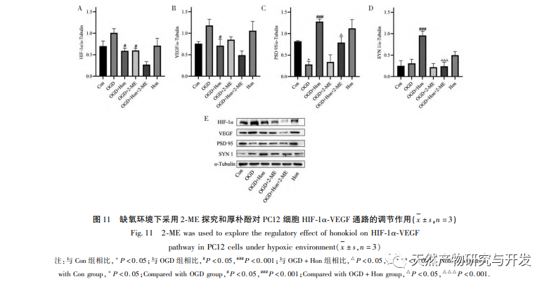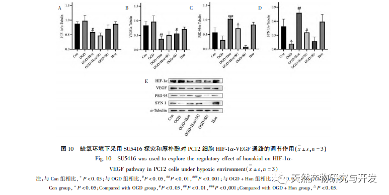 Aktivering af HIF-1 α - VEGF-signalvejen spiller en vigtig rolle i at fremme synaptisk plasticitet og effektivt vende depressionslignende adfærd og hukommelsessvigt i CUMS. Blandt dem er hypoxia inducible factor-1 (HIF-1) en transkriptionsfaktor, der reagerer på hypoxi. Som en cellulær iltreceptor er det en heterodimer, der består af ustabile alfa- og beta-underenheder, som er vidt udbredt i menneskeceller. Undersøgelser har vist, at hypoksisk prækonditionering (HP) kan øge udtrykket af HIF-1 α i hippocampus, den paraventrikulære kerne i hypothalamus og neocortex hos rotter. Der er rapporter om, at intermitterende hypoxi (IH) kan stimulere hippocampus angiogenese og neurogenese og forbedre hjernens hukommelsessvigt. Derfor er HIF-1 α-signalvejen et lovende potentielt mål for behandling af depression. Vascular endothelial growth factor (VEGF) har høj specificitet for endotelceller og har potentiale for neurotrofiske og neurobeskyttende effekter i centralnervesystemet. Forskning har vist, at VEGF påvirker synaptisk plasticitet i neuroner og kan fremme axonal vækst og neurogenese. VEGFR-2 (KDR) er en celleoverfladereceptor for VEGF, som spiller en rolle i indlæring og hukommelse ved at formidle langtidsforbedring, plasticitetsforbedring og kognitiv funktionsforbedring gennem sin receptor VEGFR-2. Sammenfattende er aktivering af HIF-1 α - VEGF-signalvejen en meget undersøgt strategi til forbedring af depressiv adfærd. Derudover kan PI3K Akt-vejen i nerveceller regulere spredning og differentiering af nerveceller og også deltage i regulering af cerebral blodgennemstrømning og fremme neuronal overlevelse, hvilket er tæt forbundet med forekomsten og udviklingen af depression. Patogenesen af depression er relateret til synaptisk plasticitetsforstyrrelse. Ændringer i synaptisk plasticitet er tæt forbundet med udtrykket af synaptiske proteiner. PSD95 er en type postsynaptisk tæt materiale (PSD) proteinfamilie, der kan regulere synaptisk transmission og synaptisk funktion. SYN1 er et specifikt markørprotein for synaptiske vesikler, som kan afspejle antallet, tætheden og fordelingen af synapser. PSD95 og SYN1 spiller en afgørende rolle for at fremme signaltransduktion og synaptisk plasticitet, og nogle antidepressive lægemidler kan forbedre den synaptiske plasticitet betydeligt. Dette stemmer overens med resultaterne i 2.8 og 2.9, hvor honokiol kan øge niveauerne af PSD95- og SYN1-proteiner for at forbedre den synaptiske plasticitet i PC12-celler.