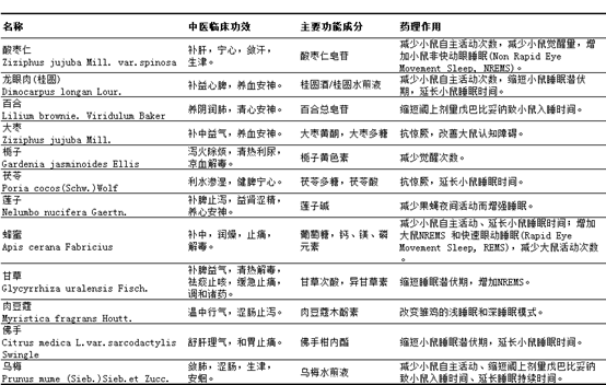 Både mad og medicin af kinesisk urtemedicin kaldes ofte mad og medicin med ressourcer, fra oldtiden til i dag mere opmærksomhed på at forbedre søvnfunktionen af mad og medicin med klasse af kinesiske urtemedicin er hovedsageligt sur jujube kerne, longan kød (kanel), lilje, jujube, gardenia, Poria, lotus osv, det meste af effekten af kinesisk medicin til at berolige ånden og genopfylde manglen er de vigtigste, effektive komponenter involveret i saponiner, flavonoider og polysaccharider og andre kemiske komponenter, den moderne farmakologimekanisme til at regulere neurotransmitterne. Den moderne farmakologiske mekanisme er baseret på regulering af neurotransmittere. Tabel 2 opsummerer typer, klinisk effekt, funktionelle komponenter og farmakologiske virkninger af de vigtigste fødevare- og lægemiddelhomologer af kinesiske plantelægemidler til forbedring af søvnfunktionen efter litteraturanalyse.