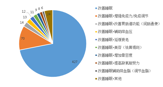 Ifølge den særlige søgeplatform for fødevareinformation på hjemmesiden for State Market Supervision Administration er i alt 594 helsekostprodukter med søvnforbedrende funktion blevet godkendt til registrering i Kina. Ved at analysere og opsummere funktionerne og formlerne for alle produkterne viser det sig, at flere helsekostprodukter med søvnforbedrende funktion er blevet godkendt til at forbedre immuniteten, forbedre mave-tarmkanalens funktion (afføringsmiddel) og hjælpe med at sænke blodtrykket osv. Fordelingen af funktionerne er vist i fig. 1. Fordelingen af produktfunktioner er vist i figur 1.