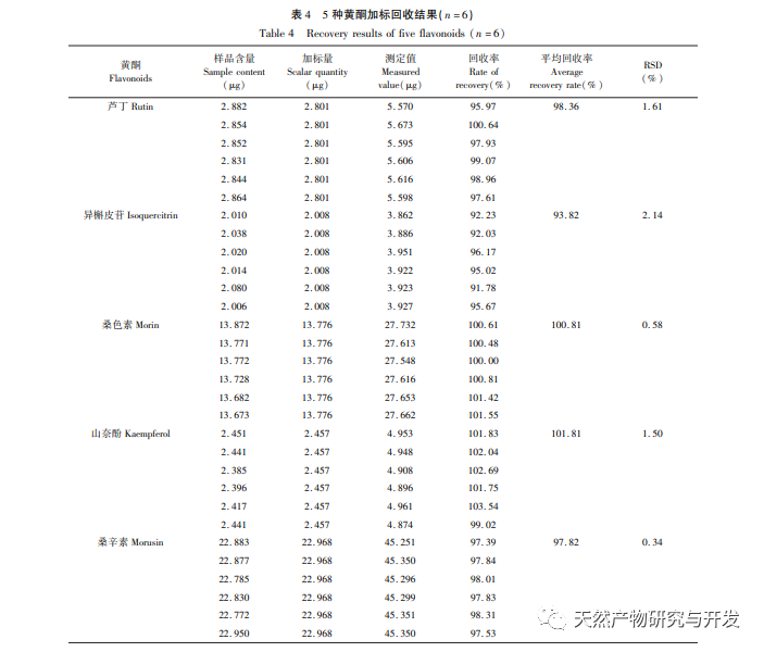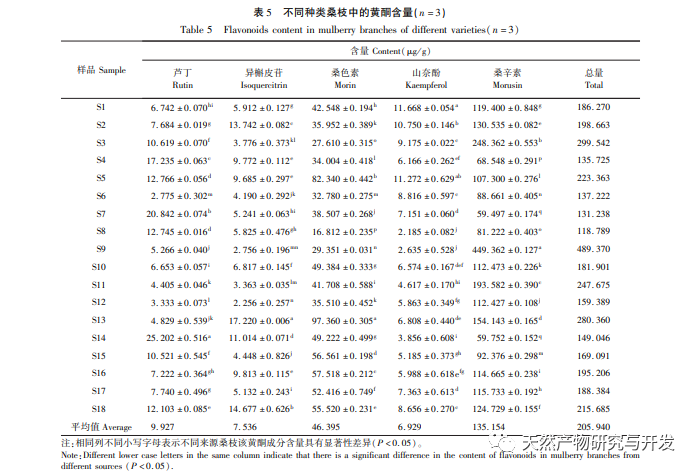 Denne undersøgelse brugte 18 partier morbærgrene fra 9 forskellige produktionsområder og 3 forskellige typer i Chongqing som eksperimentelle prøver. Ultralydsekstraktion blev udført, og ultra performance liquid chromatography (UPLC) blev brugt til at bestemme og analysere indholdet af fem flavonoider, herunder rutin, morbærpigment, kaempferol, isoquercitrin og morbærquercetin, i disse 18 partier af morbærgrene fra 9 forskellige produktionsområder og 3 forskellige typer. Forskellene i flavonoidindhold mellem de 18 partier af morbærgrene blev sammenlignet, hvilket gav dataunderstøttelse og reference til efterfølgende forskning og udvikling af morbærgrene.