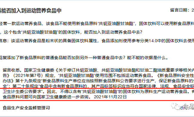I november 2021 svarede statsadministrationen for markedsovervågning og -regulering (SAMSAR) på en offentlig besked om "hvorvidt faste drikkevarer kan tilsættes til sportsernæringsfødevarer", hvilket tiltrak sig opmærksomhed, og den oprindelige tekst er vist nedenfor. Gennem meddelelsen og svaret kan det ses, at markedstilsynets holdning: det støtter ikke den forsætlige brug af specifikke råvarer til at bringe en ny fødevareingrediens, der ikke kan bruges i det endelige produkt, ind i det endelige produkt.