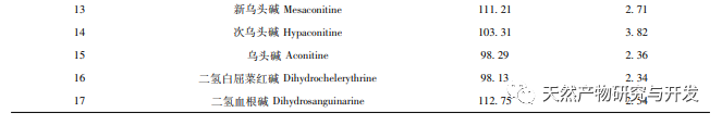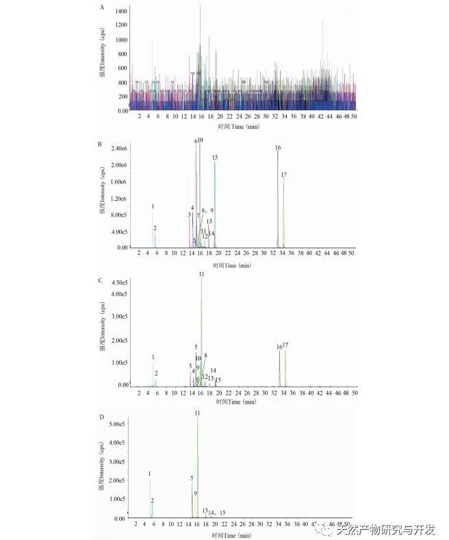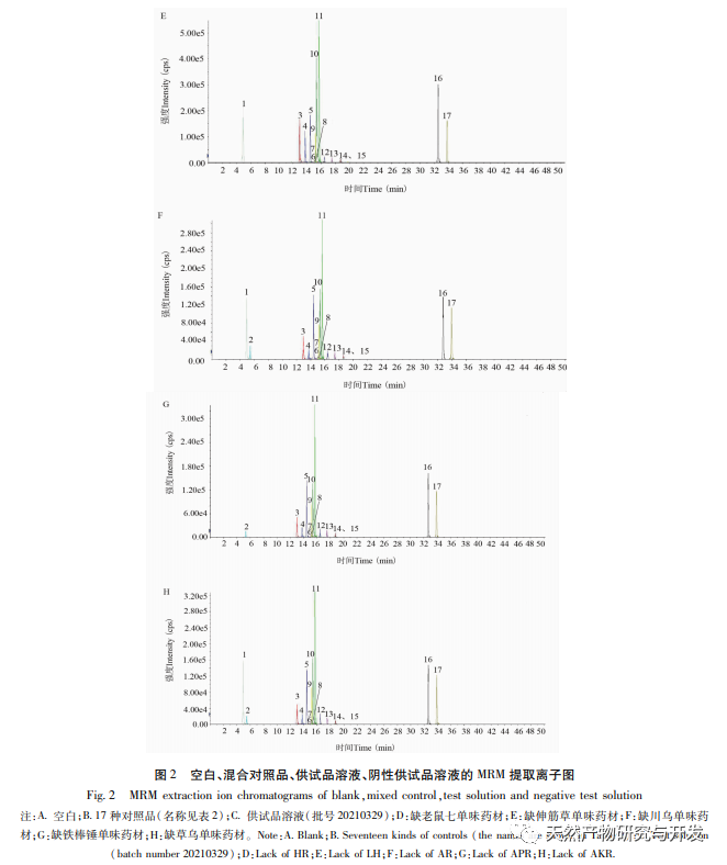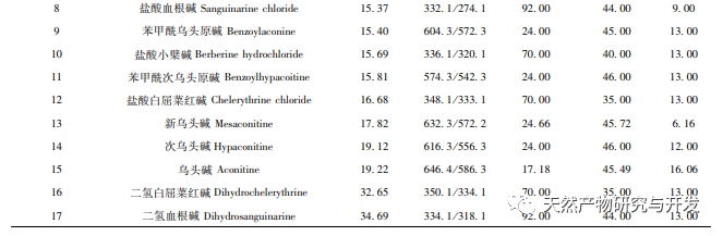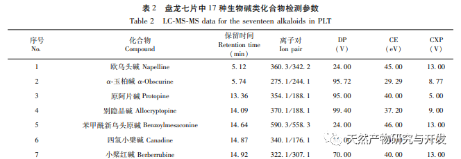 Valg af testbetingelser og forberedelsesmetoder til testopløsning. Under hensyntagen til de strukturelle og polære egenskaber ved alkaloidkomponenter anvendes MRM-scanningstilstand, hvor positive og negative iontilstande detekteres separat. Positiv iontilstand vælges til detektion baseret på responsværdier og antallet af kromatografiske toppe. Virkningerne af ekstraktionsmetoder (ultralyd, opvarmning af tilbagesvaling) og ekstraktionsmidler (vandfri ethanol, 70% methanol, 100% methanol) på ekstraktion af alkaloider fra Panlong Seven Tablets blev undersøgt. Baseret på de omfattende kromatografiske topformer og responsværdier blev methanol-ultralydsekstraktion i 25 minutter valgt som ekstraktionsmetode for alkaloider i Panlong Seven Tablets i denne undersøgelse.