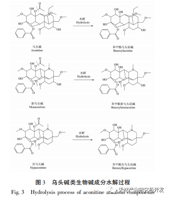 Screening af potentielle indikatorer for kvalitetskontrolkomponenter. Alkaloider er en af de vigtige komponenter i Panlong Seven Tablets, der har antiinflammatoriske og smertestillende virkninger. Blandt dem hydrolyseres de meget indholdsrige monoesteralkaloider benzoylaconitin, benzoylneoaconitin og benzoylhypaconitin fra diesteralkaloiderne aconitin, neoaconitin og hypaconitin. Samtidig med at de bevarer deres farmakologiske virkninger som f.eks. antiinflammatorisk, antireumatisk og gigtbehandling, er deres toksicitet stærkt reduceret. Baseret på den relevante forskning i alkaloidindikatorkomponenter udvælger denne artikel benzoylaconitin, benzoylneoaconitin og benzoylaconitin som potentielle kvalitetsindikatorkomponenter. Hydrolysemetoden for aconitinalkaloider er vist i figur 3.