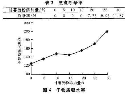 Resultaterne af kogeegenskaberne for nudler fremstillet af en blanding af sød kartoffelstivelse og hvedemel er vist i tabel 2, fig. 4 og fig. 5. Når mængden af tilsat sød kartoffelstivelse når 20%, begyndte nudlerne at gå i stykker under tilberedningen, hvilket indikerer, at nudlernes indre struktur er blevet beskadiget til en vis grad; med stigningen i mængden af tilsat sød kartoffelstivelse steg brudhastigheden gradvist.