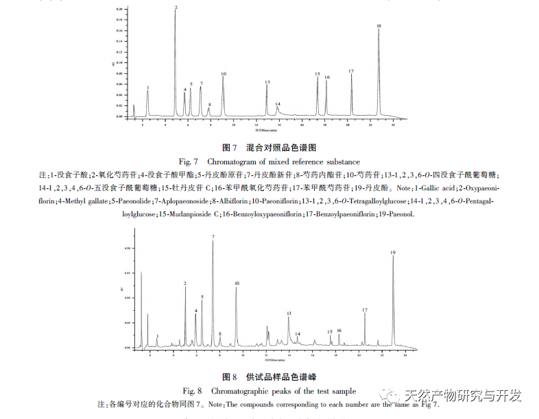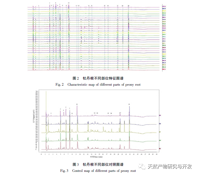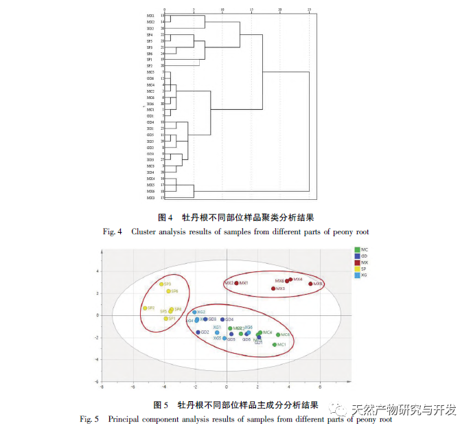 Den kemiske sammensætning af forskellige dele af pæonerødder blev grundigt karakteriseret gennem UPLC-karakteristikkort, og den kemiske information om forbundet pæonbark, skrabet pæonbark, træhjerte, korkbark og fibrøse rødder blev grundigt sammenlignet. HCA- og PCA-analyse viste, at den kemiske sammensætning af forbundet pæonbark, skrabet pæonbark og fibrøse rødder var ens og kunne grupperes sammen. Den kemiske sammensætning af træhjerte var relativt lav, og hovedkomponenterne som paeonol og paeoniflorin havde et lavt indhold, mens den kemiske sammensætning af korkbark var relativt rig.