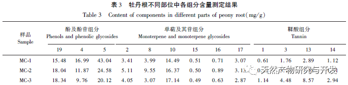 Ti karakteristiske differentierede komponenter i forskellige dele af pæonerødder blev screenet ved hjælp af PLS-DA. Syv komponenter, herunder gallussyre, paeonolglykosid, paeoniflorin, 1,2,3,6-O-tetragalloylglukose, 1,2,3,4,6-O-pentagalloylglukose, benzoyloxideret paeoniflorin og benzoylpaeoniflorin, blev identificeret på baggrund af referencestandarden. Samtidig blev 13 funktionelle komponenter med et indhold på mere end 0,1 mg/g (oxideret paeoniflorin, methylgallat, nyt paeonolglykosid, paeoniflorinlactonglykosid, paeoniflorin C og paeonol) kombineret til indholdsbestemmelse. Den kemiske sammensætning af forskellige dele af pæonerødder blev analyseret ved at klassificere kemiske komponenter som fenoler og fenoliske glykosider, monoterpener og deres glykosider og garvesyrekomponenter. Regel. Resultaterne af indholdsbestemmelsen viser, at den kemiske sammensætning af forskellige dele af pæonerødder har både ligheder og forskelle, og årsagen til forskellene kan være relateret til syntese og overførsel af sekundære metabolitter under pæonens vækst. Indholdet af fenoler, fenoliske glykosider og garvesyrer i Lian Dan Pi svarer nogenlunde til indholdet i Scrap Dan Pi, men indholdet af monoterpener og deres glykosidkomponenter er højere end i Scrap Dan Pi. Det stemmer overens med Wu Chuncao et al.s litteraturrapporter, som indikerer, at monoterpener og deres glykosidkomponenter hovedsageligt ophobes i det yderste korklag. Shi Suying et al. fandt, at indholdsfordelingen af monoterpenglykosidkomponenter i forskellige dele af pæonerødder er større i korklaget end i floemet end i træet, hvilket tyder på, at den sekundære metabolismes akkumuleringsegenskaber af monoterpenglykosidkomponenter i de karakteristiske komponenter i Paeonia er de samme. Andelen af korkbark i Liandan-bark er relativt lille, men den indeholder rigelige kemiske komponenter med en høj koncentration af monoterpenoidglykosider. Dette indikerer, at Liandanpi med hensyn til klinisk effekt kan være bedre end skrabet danpi, og det tyder også på, at det er mere hensigtsmæssigt at bevare korkstedet under forarbejdningen af pæonbark i produktionsområdet.