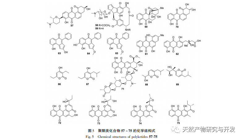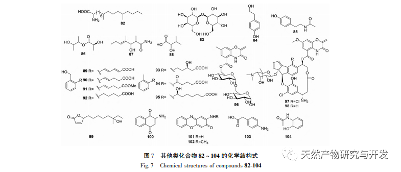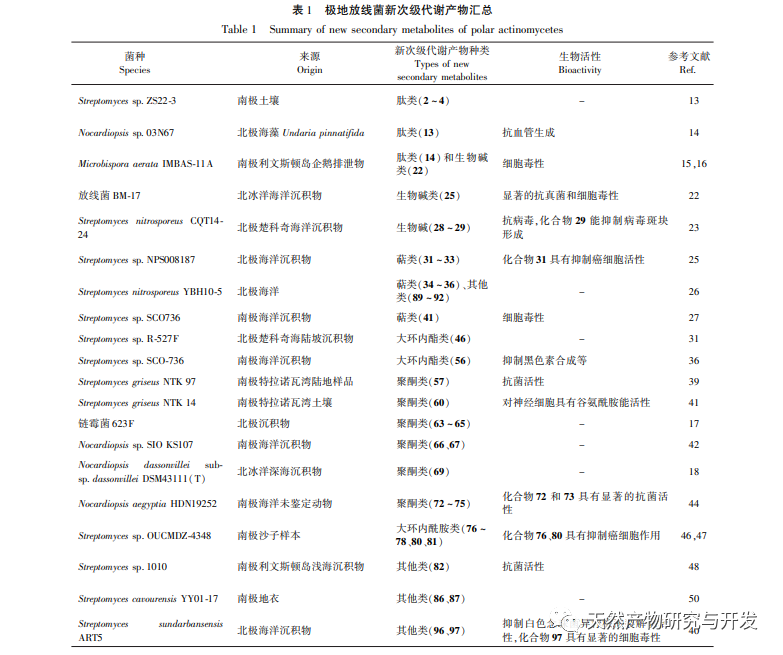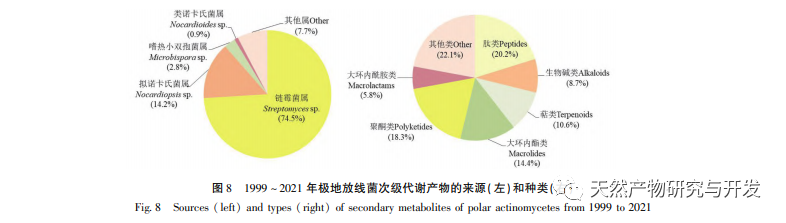 Fra 1999 til 2021 blev 104 sekundære metabolitter fra polære actinomyceter rapporteret både nationalt og internationalt, hvoraf 44 (42,3%) var nye forbindelser. Oversigten over nye sekundære metabolitter er vist i tabel 1. De fleste af de sekundære metabolitter fra polære actinomyceter blev isoleret fra Streptomyces-slægten (74,5%), mens en lille del blev isoleret fra pseudo-Nocardia-slægten (14,2%), termofile Bacillus-slægter (2,8%), Nocardia-lignende slægter (0,9%) og andre slægter (7,7%) (Figur 8, til venstre). Ifølge klassificeringen af kemiske strukturtyper er 21 (20,2%) af de 104 sekundære metabolitter peptidforbindelser, 9 (8,7%) er alkaloider, 11 (10,6%) er terpener, 15 (14,4%) er makrolider, 19 (18,3%) er polyketoner, 6 (5,8%) er makrolactamer, og 23 (22,1%) er andre typer af forbindelser. De vigtigste strukturelle typer er peptider, polyketoner, makrolider osv. (figur 8, højre). Blandt dem omfatter de sekundære metabolitter med meget sjældne strukturer nitroporosiner A (29) og B (30), antartin (41), gephyromycin (41) osv. 60), saliniquinoner G-I (72-74) osv. De fleste af de 104 sekundære metabolitter har gode farmakologiske aktiviteter som f.eks. antibakterielle, svampedræbende, antivirale og cytotoksiske. Det er hovedsageligt kendetegnet ved antitumoraktivitet, som har hæmmende aktivitet på leukæmi, tyktarmskræft, epidermal kræft, myelom, livmoderhalskræft, brystkræft, melanom, gastrisk kræft og andre tumorceller. Nogle forbindelser har signifikant aktivitet, såsom C-1027 chromophore-V har signifikant cytotoksicitet, saliniquinoner G ~ H har signifikant antibakteriel aktivitet, og N - (2-hydroxypheny1) -2-phenazinamin (NHP) har signifikant antifungal og cytotoksicitet. Derudover har nogle forbindelser også selektiv hæmmende effekt. Det næste er antibakteriel aktivitet, herunder antibakteriel og antifungal aktivitet, som har hæmmende virkninger på Candida albicans, Escherichia coli, Pseudomonas aeruginosa, Staphylococcus aureus, Bacillus subtilis, Proteus mirabilis, Bacillus cereus, Bacillus subtilis og Micrococcus luteus. Nogle få har effekter som antiangiogenese, antioxidant, reduktion af cellulære lipidniveauer, hæmning af melaninsyntese og glutaminaktivitet. Yderligere forskning og udvikling er berettiget for sekundære metabolitter med nye strukturer, selv sjældne skeletter, og betydelig aktivitet, såsom nitrosporosiner A (29) og B (30), antagonist (41), gephyromycin (60) og salinequine G-I (72-74).