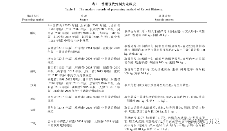 Denne artikel gennemgår historien og den aktuelle status for forarbejdningen af Xiangfu og finder, at der er 8 forarbejdningsmetoder i forarbejdningsstandarderne i 23 provinser og byer indsamlet over hele landet. Der er mere end 20 forarbejdningsmetoder i forskellige dynastier, og de mest almindeligt anvendte er eddike og fire metoder. Det har vist sig, at der er uregelmæssigheder i brugen af hjælpematerialer i forarbejdningen af Xiang Fu. For eksempel er brugen af Xiang Fu gradvist faldet på grund af besværlig materialeindsamling og andre årsager. Ingefær, vin (eller gul vin), salt (eller Daqing-salt), eddike og honning er stadig hjælpematerialer til forarbejdning af Xiang Fu, og specifikationerne for hjælpematerialerne er ikke angivet. Der mangler også ensartethed i forarbejdningsmetoderne, herunder blanding med hjælpematerialer separat efter ristning, forskellige metoder til forarbejdning af flere hjælpematerialer trin for trin og uklare parametre som dosering af hjælpematerialer, ristningstemperatur og slutpunkt for forarbejdning. Med hensyn til effekt og indikationer er der ingen klar skelnen mellem effekt og indikationer for forskellige forarbejdede produkter og råprodukter. Forskellige behandlingsmetoder er ikke blevet klart forklaret med henblik på at forbedre forskellige effekter eller skabe nye effekter. Under vejledning af traditionel kinesisk medicinbehandlingsteori kombineret med farmakologiske eksperimenter og kvalitetsmarkører bør rimelige medicinske hjælpestoffer og optimale behandlingsmetoder screenes, hjælpestofstandarder bør formuleres, og behandlingsspecifikationerne og kvalitetsstandarderne for Xiangfu bør forbedres.