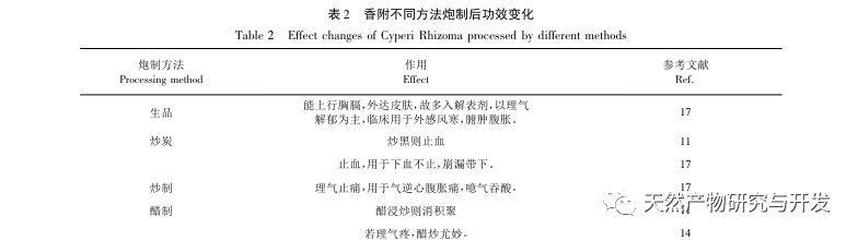 Flygtig olie og det høje indhold af α-kumarin i flygtig olie anses for at være effektive ingredienser, men deres indhold falder under forarbejdningen. Det tyder på, at typerne og sammensætningsforholdene af flygtige olier kan ændre sig eller omdannes til andre komponenter under forarbejdningen, og der er relativt lidt forskning på dette område. Når man studerer Xiangfus virkninger på kroppen, vælger man ofte en eller flere aktive ingredienser som α-Xiangfu-keton, Xiangfu-enon og sugenol for at studere lokale fysiologiske og patologiske ændringer. Behandlingsprocessen for traditionel kinesisk medicin er interventionsprocessen for lægemiddelsystemet på kropssystemet, og en eller flere monomerer kan ikke fuldt ud repræsentere hele den traditionelle kinesiske medicin.