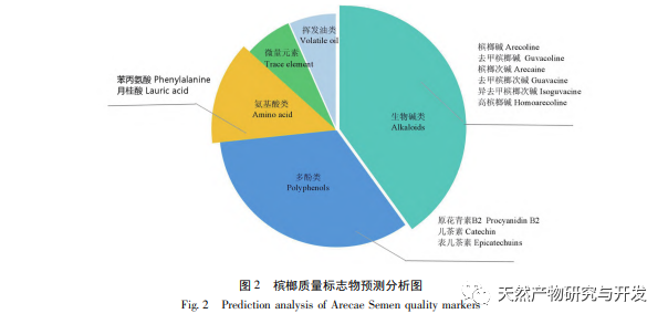 Die Betelnuss als traditionelle chinesische Medizin (ethnische Medizin) hat eine lange Geschichte der Anwendung, eine breite Wirksamkeit und gute klinische Effekte. Gegenwärtig haben Wissenschaftler im In- und Ausland eine Reihe von Forschungsergebnissen über die chemische Zusammensetzung, die pharmakologischen Wirkungen und die Qualitätsbewertung der Betelnuss erzielt. Auf der Grundlage eines Überblicks über die chemische Zusammensetzung, die pharmakologischen Wirkungen und die toxischen Wirkungen der Betelnuss führt dieser Artikel eine Literaturanalyse durch und spekuliert über mögliche Q-Marker-Kandidaten der Betelnuss auf der Grundlage ihrer einzigartigen chemischen Zusammensetzung, der messbaren chemischen Zusammensetzung, der traditionellen medizinischen Wirksamkeit, der Kompatibilität von Medikamenten, des Einflusses der Verarbeitung auf die chemische Zusammensetzung und der Blutkomponenten. Importieren Sie die spekulierten Kandidatenkomponenten, die als Q-Marker für Betelnuss verwendet werden können, in eine Excel-Tabelle und stellen Sie die Ergebnisse anhand der Häufigkeit ihres Auftretens dar, wie in Abbildung 2 gezeigt. Aus der Abbildung ist ersichtlich, dass zu den Kandidaten für Q-Marker für Betelnuss Alkaloide, Polyphenole, Aminosäuren, ätherische Öle und Spurenelemente gehören, wobei Alkaloide und Phenole die wichtigsten sind. Unter den Alkaloiden gibt es sechs Komponenten: Arecolin, demethyliertes Arecolin, Arecolin, demethyliertes Arecolin, isodemethyliertes Arecolin und hohes Arecolin; polyphenolische Komponenten umfassen drei Arten: Anthocyane B2, Catechine und Epicatechine; Aminosäureverbindungen, einschließlich Phenylalanin und Laurinsäure, sind die wichtigsten Komponenten.