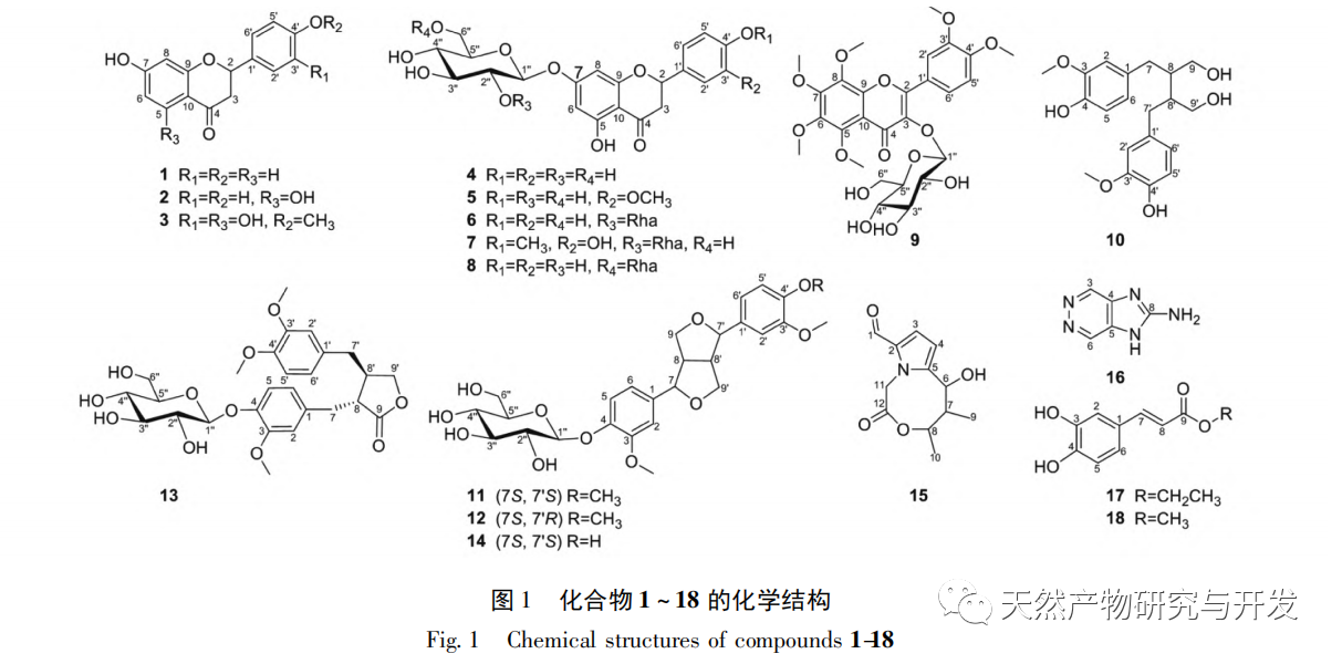 In der Literatur über die chemische Zusammensetzung von Angelica dahurica wird allgemein angenommen, dass die wichtigsten chemischen Komponenten in Angelica dahurica Cumarinverbindungen sind, während es nur wenige Berichte über Nicht-Cumarinverbindungen in Angelica dahurica gibt. Lu et al. isolierten und identifizierten einst ein Pyrrolalkaloid, Cumarin, aus Angelica dahurica. In unserer systematischen Studie über Angelica dahurica hat unsere Forschungsgruppe nicht nur eine große Menge an Cumarinen und Cumarin-Dimeren isoliert, sondern auch 16 Pyrrolalkaloide aus Angelica dahurica isoliert, was unser Verständnis der chemischen Zusammensetzung der Pflanze bereichert. Bei der weiteren Erforschung der chemischen Zusammensetzung von Bai Zhi wurden unerwartet 18 Komponenten isoliert, die keine Cumarine sind und über die in diesem Artikel berichtet wird. Zusätzlich zu dem zuvor berichteten Alkaloid Jin Qian Cao wurden die anderen 17 Nicht-Cumarin-Komponenten, darunter 9 Flavonoide, 5 Lignane, 2 einfache phenolische Ester und 1-H-Imidazo [4,5-d] Pyridazin-2-amin, alle zum ersten Mal aus Bai Zhi isoliert. Die Verbindungen 3 und 18 haben gewisse hemmende Wirkungen auf die durch Zymosan induzierte Freisetzung von Superoxid aus Neutrophilen, während die Verbindungen 1 und 18 hemmende Wirkungen auf die Freisetzung von NO-Aktivität aus RAW 264.7-Zellen haben. Es ist erwähnenswert, dass es zwar mehrere Literaturberichte über das Vorhandensein von Flavonoiden in Angelica dahurica gibt, dass es sich dabei jedoch ausschließlich um vorläufige Berichte über die Bestimmung des Gesamtflavonoidgehalts handelt. Derzeit gibt es keine Berichte über die Isolierung von monomeren Flavonoiden aus Angelica dahurica. In dieser Studie wurden jedoch zum ersten Mal mehrere Flavonoide und Flavonoidglykosidmonomere aus Angelica dahurica gewonnen, was uns sehr überrascht hat. Wir hatten Zweifel, ob es sich um ein Problem mit den medizinischen Materialien handelte, aber eine weitere Analyse der isolierten und in diesem Artikel berichteten Verbindungen 1, 6, 7 und 8 wurde in Angelica dahurica aus drei verschiedenen Herkünften, Hangbai, Chuanbai und Yubai, mittels LC-MS gefunden. Dies deutet darauf hin, dass die Verbindungen 1, 6, 7 und 8 in Angelica dahurica aus verschiedenen Herkunftsländern nachgewiesen werden können. Bai Zhi könnte tatsächlich Flavonoide enthalten. Die Forschungsergebnisse haben das Verständnis der chemischen Zusammensetzung von Angelica dahurica bereichert und wichtige Hinweise für die Qualitätskontrolle und die Entwicklung und Nutzung der Pflanze geliefert.