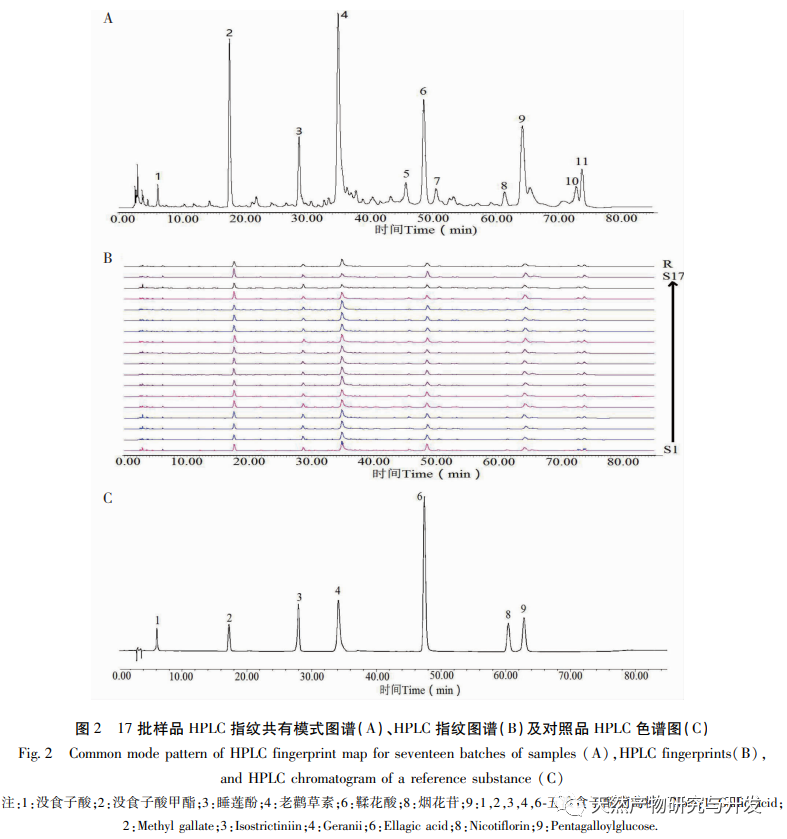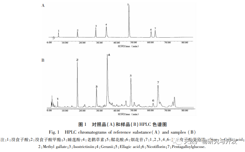 Die Ein-Test-Mehrfach-Bewertungsmethode kann nicht nur für die Qualitätskontrolle mehrerer Komponenten verwendet werden, sondern auch das Problem der knappen Referenzmaterialien und der hohen Testkosten lösen. Sie ist eine wichtige Methode und Entwicklungsrichtung für die Inhaltsbestimmung und Qualitätskontrolle der traditionellen chinesischen Medizin. Die alleinige Verwendung der chemischen Zusammensetzung als Bewertungsindex wird den Anforderungen der Qualitätskontrolle ethnischer Arzneimittel jedoch nur schwer gerecht. Gegenwärtig ist die Kombination von Fingerabdruck-Spektrum und einseitiger Multi-Bewertungsmethode ein gängiges Mittel zur Qualitätskontrolle traditioneller chinesischer Medizin, das die Nachteile der Bewertung der Qualität medizinischer Materialien allein auf der Grundlage ihres Inhalts vermeidet. In diesem Artikel wurde ein Fingerabdruckspektrum der Seerose erstellt, wobei die chromatographischen Peaks von Gallussäure, Methylgallat, Seerosenphenol, Geraniol, Gerbsäure, Feuerwerksglykosid und 1,2,3,4,6-Pentagalloylglukose identifiziert und bestimmt wurden. Die Zusammensetzung und der Gehalt der 17 Chargen von Schlaf-Lotus-Heilkräutern sind in etwa gleich, und es gibt keinen signifikanten Unterschied. Die Ähnlichkeitsergebnisse mit dem Kontroll-Fingerabdruckspektrum sind alle größer als 0,9. Die Ähnlichkeit zwischen den beiden Chargen der im Handel erhältlichen Schlaf-Lotus-Heilkräuter und dem Kontroll-Fingerabdruckspektrum beträgt jedoch nur 0,568 bzw. 0,730. Darüber hinaus wurde in der Literatur anhand von DNA-Barcode-Untersuchungen festgestellt, dass die im Handel erhältlichen Seerosen den weißen Seerosen und den weichhaarigen Seerosen mit gezähnten Blättern sehr ähnlich sind, und die Ergebnisse dieser Studie bestätigen dies ebenfalls. Diese Qualitätsanalysemethode kann die Qualität von Lotusblüten-Heilmitteln sowohl unter qualitativen als auch unter quantitativen Aspekten bewerten, die Qualitätsstandards von Lotusblüten-Heilmitteln verbessern, ihre Quellen standardisieren und Referenzdaten für die Entwicklung und Anwendung von Lotusblüten-Heilmitteln liefern.