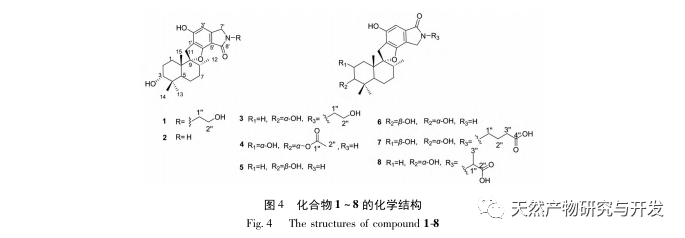 PSM-Verbindungen werden derzeit nur aus Pilzen der Gattungen Botrytis und Umeda isoliert, was sie zu charakteristischen Molekülen dieser beiden Pilzarten macht. Die Verbindung Stackybotrin D weist eine signifikante Anti-HIV-Aktivität auf, mit EC50-Werten zwischen 6,2 und 23,8 μ M gegen HIV-1 wt, HIV-1 RT-K103N und andere mutierte Stämme. Jia et al. fanden heraus, dass die IC50-Werte von Bistachybotrysin K bei Tumorzelllinien wie HCT116 und NCI-H460 zwischen 1,1 und 4,7 μ M lagen. In dieser Studie wurden die Sekundärmetaboliten im Stamm Stachybotrys sp. CPCC 401591 untersucht. Durch die Kombination der charakteristischen UV-Absorption der Verbindungen (230, 285, 330 nm) und den Einsatz verschiedener chromatographischer und moderner spektroskopischer Techniken wurden die Strukturen von acht PSM-Verbindungen isoliert und bestimmt. In Verbindung mit der GNPS-Analyse wurde festgestellt, dass der Fermentationsextrakt des Stammes immer noch mehrere Monomere und Dimere der PSM-Klasse enthielt, aber die monomeren Verbindungen konnten aufgrund des geringen Gehalts nicht gewonnen werden. Daher können mehr PSM-Moleküle gefunden werden, indem die Fermentationsausbeute weiter erhöht, die Fermentationsbedingungen optimiert und die HPLC-UV-MS-Technologie kombiniert wird. Derzeit haben wir die Sequenzierung des gesamten Genoms des Stammes Stachybotrys sp. CPCC 401591 abgeschlossen und durch Genom-Mining-Methoden zwei mögliche biosynthetische Gencluster psd1 und psd2 für PSM-Verbindungen gefunden. Beide Gencluster enthalten Gene, die für die Polyketidsynthase und die Sesquiterpen-Synthase kodieren, während dieser Gencluster für eine Vielzahl von Enzymen kodiert, die nach der Modifizierung der Verbindungen wirken (einschließlich P450-Oxidase, kurzkettige Dehydrogenase und Acetyltransferase usw.). Dies bildet die Grundlage für unsere künftige Forschung zur Verwendung von Gen-Knockout-Strategien, um die Biosynthesewege von PSM-Verbindungen aufzuklären und die Funktionen wichtiger biologischer Enzyme zu identifizieren. Diese Studie zeigt also, dass der Traubenohrpilz Stachybotrys sp. CPCC 401591 PSM-Verbindungen produzieren kann, was die strukturelle Vielfalt seiner Sekundärmetaboliten bereichert. Er ist ein wichtiges Ressourcenbakterium, das weitere Forschung verdient.