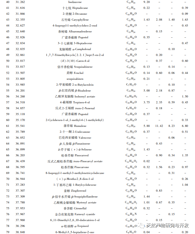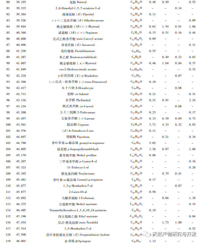 Der Geruch ist derzeit eines der wichtigsten Mittel zur Beurteilung der Qualität von Heilpflanzen, und die in Heilpflanzen enthaltenen flüchtigen Bestandteile können ihnen einen einzigartigen Geruch verleihen. Daher sind flüchtige Bestandteile ein wichtiger Indikator für die Bewertung der Qualität von Heilpflanzen. Die Forschung über flüchtige Bestandteile in Xianghe konzentriert sich hauptsächlich auf den Teil der Blütenknospe. Derzeit sind mehr als 50 flüchtige Bestandteile bekannt. Die Ergebnisse dieses Versuchs zeigen, dass insgesamt 25 Verbindungen (wie α-Pinen, β-Pinen, D-Limonen usw.) als flüchtige Bestandteile gemeldet wurden, was im Wesentlichen mit den Ergebnissen von Zhang Sijie übereinstimmt. Darüber hinaus wurden in diesem Experiment auch die flüchtigen Bestandteile der Wurzeln, Stängel und Blätter von Xianghe gemessen, was neue Ideen für die vielfältige Nutzung von Xianghe liefern kann.
