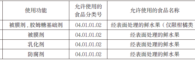 Die Abfrage der Tabelle A.1 (Zulässige Verwendungsarten, Verwendungsbereich und maximale Verwendungsmenge oder Rückstandsmenge von Lebensmittelzusatzstoffen) des GB 2760 ergab, dass der GB 2760 die Verwendung dieser vier speziesreinen Lebensmittelzusatzstoffe zulässt und sie einen gemeinsamen Verwendungsbereich haben, der in oberflächenbehandelten frischen Zitrusfrüchten verwendet werden kann. Siehe Tabelle 1 für Einzelheiten.