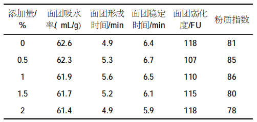 Los resultados de la prueba de calidad de la harina se muestran en la Tabla 1 cuando se añadieron a la harina 0,5~2 % de almidón de acetato en diferentes cantidades.