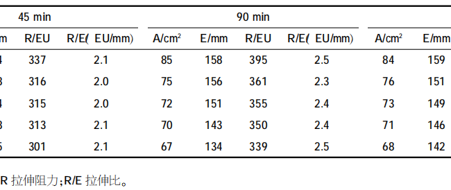 Los índices de estiramiento de la masa incluyen principalmente: área de estiramiento, grado de estiramiento, resistencia al estiramiento y relación de estiramiento. Cuando la cantidad de adición de almidón de acetato fue 0, 0,5 %, 1 %, 1,5 % y 2 %, el estiramiento de la harina se mostró en la Tabla 2.