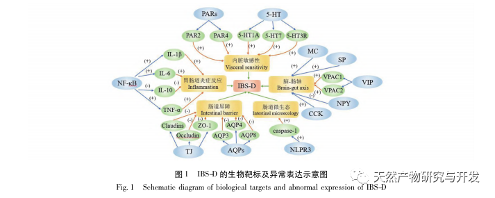 El síndrome del intestino irritable con predominio de diarrea (SII-D) es el subtipo más común del síndrome del intestino irritable (SII), caracterizado por diarrea, dolor abdominal y malestar. El SII-D pertenece a la categoría de "diarrea" en la investigación de la medicina tradicional china, y su localización es en el tracto gastrointestinal. En la actualidad, la tasa de incidencia mundial del SII es de 11%, y la tasa de incidencia del SII-D representa el 23,4% del SII. La patogénesis del SII-D es relativamente compleja. Según la investigación médica moderna, ahora se sabe que la formación del SII-D está relacionada con factores como la inflamación gastrointestinal, el aumento de la sensibilidad visceral, el eje cerebro-intestino anormal, la microbiota intestinal alterada y la barrera intestinal dañada. Estos mecanismos patológicos influyen en la aparición y el desarrollo del SII-D. Hay muchos factores de señalización y vías de señalización clave en el proceso patológico del SII-D, que pueden utilizarse como dianas biológicas clave para el tratamiento del SII-D (véase la Figura 1). Inhibiendo, activando o regulando estas dianas biológicas, es beneficioso reducir la tasa de incidencia del SII-D y mejorar el efecto terapéutico de los fármacos.