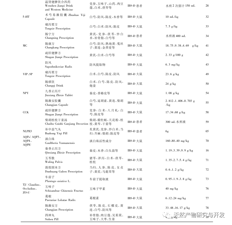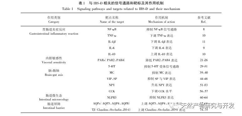 El SII-D es una enfermedad gastrointestinal frecuente en la población. La patogénesis del SII-D es compleja y, según las tendencias actuales de la investigación, factores como la inflamación gastrointestinal, el aumento de la sensibilidad visceral, el eje cerebro-intestino anómalo, la alteración de la microbiota intestinal y el daño de la barrera intestinal se consideran las principales causas del SII-D. Existen múltiples vías clave y factores de señalización implicados en la patogénesis del SII-D, que sirven como indicadores objetivos para detectar el SII-D e importantes dianas biológicas para tratar el SII-D. Mediante el estudio de los objetivos clave en el mecanismo patológico del SII-D regulado por la medicina tradicional china y sus fórmulas, se sugiere que la medicina tradicional china tiene un efecto terapéutico significativo en la inflamación gastrointestinal mediante la inhibición de la vía de señalización NF - κ B y factores inflamatorios como TNF - α, IL-1 β, IL-6, y la regulación de la expresión del factor anti-inflamatorio IL-10; La reducción de la expresión de PAR2 y PAR4 y la inhibición de la vía de señalización del receptor 5-HT puede aliviar la hipersensibilidad visceral; Mediante la inhibición de MC y la regulación de los niveles de expresión de las hormonas peptídicas intestinales cerebrales VIP, SP, NPY y CCK en el eje cerebro-intestinal, se puede regular el eje cerebro-intestinal; La inhibición de la expresión de NLPR3 puede mejorar el trastorno de la microbiota intestinal y regular la microbiota intestinal; Además, la expresión de AQPs en el intestino puede ser regulada para regular el metabolismo del agua, y la expresión de Claudins, Occludin, y ZO-1 puede ser regulada para restaurar la mucosa intestinal TJ y lograr el objetivo de restaurar la barrera intestinal (ver Tabla 1). La medicina tradicional china y sus fórmulas compuestas han demostrado importantes efectos terapéuticos en el SII-D, que pueden mejorar significativamente los síntomas clínicos como diarrea, dolor abdominal y malestar, aliviar el dolor físico y mental de los pacientes, y la medicina china es significativamente superior a la medicina occidental tanto en eficacia como en efectos secundarios en el tratamiento del SII-D.