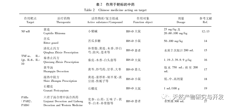 La investigación de la medicina tradicional china divide el SII-D en múltiples tipos de síndromes basados en el método de diferenciación y tratamiento de los mismos, incluyendo principalmente el síndrome de depresión hepática y deficiencia de bazo, el síndrome de calor húmedo del estómago del bazo, el síndrome de deficiencia de bazo y obstrucción por humedad, el síndrome de deficiencia de yang del riñón del bazo, etc. Para varios tipos de síndromes, diferentes medicinas tradicionales chinas y fórmulas tienen efectos reguladores sobre sus objetivos biológicos relacionados. A través del estudio de las medicinas tradicionales chinas que actúan sobre diversos objetivos (véase la Tabla 2), se encontró que las medicinas chinas con alta frecuencia de aparición en el tratamiento del SII-D incluyen Huanglian y Huangqin, que tienen principalmente la función de eliminar el calor y la humedad; Astragalus membranaceus y Atractylodes macrocephala, que tienen la función principal de tonificar el qi y el bazo; Paeonia lactiflora, que tiene la función principal de ablandar el hígado y aliviar el dolor, pertenece a los meridianos de hígado y bazo; Chenpi, que tiene la función principal de regular el qi y fortalecer el bazo; Yam, con la función principal de tonificar el bazo y los riñones. La formación del SII-D está relacionada principalmente con trastornos del bazo y el estómago, siendo el calor húmedo del bazo y el estómago y la depresión del hígado y la deficiencia del bazo las principales causas del SII-D. Las terapias de medicina tradicional china, como calmar el hígado y fortalecer el bazo, secar la humedad y fortalecer el bazo, calentar los riñones y tonificar el bazo, son de gran importancia para el tratamiento del SII-D. Por lo tanto, también se pueden llevar a cabo más investigaciones sobre la regulación de los objetivos biológicos relacionados con el SII-D mediante la medicina tradicional china y sus fórmulas compuestas desde la perspectiva de la diferenciación y el tratamiento del síndrome de la MTC.