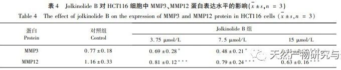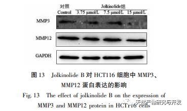 L'invasion et la métastase des tumeurs est un processus complexe impliquant des interactions intercellulaires et la dégradation de la matrice extracellulaire. La dégradation de la matrice extracellulaire dépend de la synthèse et de l'activation d'enzymes qui dégradent les composants de la matrice. Les métalloprotéinases matricielles (MMP) sont une classe d'enzymes protéolytiques dépendantes du zinc et présentant une homologie structurelle. Leur principale fonction physiologique est de dégrader les composants de la matrice extracellulaire tels que le collagène, la gélatine, l'élastine, la fibronectine et les protéoglycanes. Les recherches ont montré que la métalloprotéinase matricielle 3 (MMP-3) et la métalloprotéinase matricielle 12 (MMP-12) jouent un rôle crucial dans la dégradation de la matrice extracellulaire par les cellules tumorales et sont étroitement liées au potentiel d'invasion, aux métastases et au pronostic de diverses tumeurs malignes chez l'homme. Par conséquent, les expériences de validation par Western blot au niveau cellulaire ont montré que le Jolkinolide B réduit de manière significative l'expression des MMP-2 et MMP-12 afin d'inhiber l'invasion et la métastase des tumeurs. D'après les résultats de l'analyse pharmacologique en réseau, le Jolkinolide B peut intervenir dans le CRC par le biais de cibles et de voies multiples, et son inhibition de l'invasion tumorale et des métastases peut être liée à son impact sur l'expression des MMP-2 et MMP-12.
