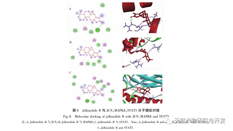 Les résultats de l'annotation GO indiquent que la plupart des cibles de la Jolkinolite B sont situées dans la matrice cellulaire et les complexes de transcription, et qu'elles sont impliquées dans diverses réponses au stress et divers processus biologiques dans les cellules. Ce résultat suggère que la Jolkinolite B peut être impliquée dans la régulation de la plupart des activités de la vie cellulaire. Les résultats de l'analyse d'enrichissement KEGG indiquent que les effets pharmacologiques de la Jolkinolite B impliquent l'interaction de plusieurs voies, notamment la voie de signalisation IL-17, la voie de signalisation PD-1/PD-L1 et la voie de signalisation HIF-1. Les résultats de l'amarrage moléculaire indiquent que le Jolkinolide B forme des interactions hydrogènes et hydrophobes avec les protéines centrales STAT3, MAPK8 et JUN, avec une structure stable et une valeur potentielle pour la recherche, démontrant les caractéristiques multi-cibles et multi-voies du Jolkinolide B dans le traitement du CCR.