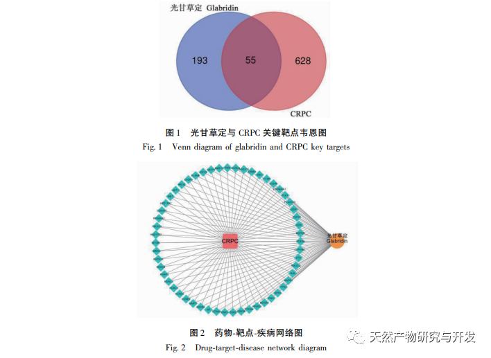 La glabridine est un composé flavonoïde extrait de la réglisse, qui possède un large éventail d'activités biologiques telles que l'anti-inflammation, l'antioxydation, la lutte contre les tumeurs, la neuroprotection et la lutte contre l'ostéoporose. La glycyrrhizine inhiberait la prolifération des cellules tumorales et induirait l'apoptose dans le cancer du sein, le cancer du foie, le cancer gastrique et le cancer du col de l'utérus. Cependant, le mécanisme moléculaire de la glycyrrhizine sur le CPRC n'est pas entièrement compris. La pharmacologie des réseaux est une combinaison de pharmacologie, d'informatique et de réseaux d'information basée sur la biologie des systèmes, qui fournit de nouvelles idées pour la découverte et la sélection de médicaments dans les maladies complexes. Pour étudier plus avant le mécanisme d'action du Guanggancao Ding sur le CRPC, nous avons utilisé la pharmacologie de réseau, l'ancrage moléculaire et les expériences cellulaires pour explorer son mécanisme d'action, fournissant ainsi une référence pour la recherche fondamentale sur les médicaments et les applications cliniques à venir.