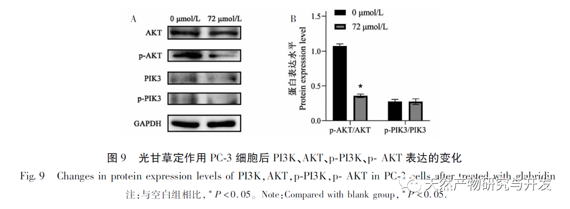 Nous avons également constaté, par la méthode CCK8, que la glycyrrhizine peut inhiber de manière significative la prolifération des cellules PC-3. Des expériences de cytométrie de flux et de coloration DAPI ont montré qu'elle pouvait induire l'apoptose des cellules, et une diminution du nombre de cellules et un rétrécissement morphologique ont été observés au microscope. Pour le criblage des concentrations de médicaments antitumoraux, nous avons constaté que leur IC50 était légèrement plus élevé, ce qui est lié à la méthode d'ancrage semi-flexible utilisée pour l'ancrage moléculaire. Par rapport à l'amarrage flexible, l'énergie de liaison calculée par l'amarrage semi-flexible est plus faible. En outre, en tant qu'antioxydant naturel, la glycyrrhizine a de puissants effets antioxydants. Cependant, les antioxydants naturels à faible dose n'ont pas montré une bonne activité antitumorale dans les expériences antitumorales, tandis que les antioxydants naturels à forte dose ont des effets toxiques sur les cellules, et leur mécanisme spécifique doit être exploré plus avant. Sur la base de la voie de signalisation KEGG prédite par la pharmacologie de réseau, nous prévoyons que l'effet inhibiteur de la glycyrrhizine sur les cellules PC-3 peut être principalement lié à la voie de signalisation PI3K/AKT. D'autres expériences de Western blot ont été menées pour étudier l'effet de la glycyrrhizine sur l'expression des protéines liées à la voie de signalisation PI3K/AKT dans les cellules PC-3. Les résultats ont montré que la glycyrrhizine peut inhiber de manière significative le processus de phosphorylation des protéines AKT. Dans notre expérience, il a été observé que la glycyrrhizine peut inhiber de manière significative l'expression de la protéine AKT phosphorylée, mais l'effet inhibiteur sur l'expression de la protéine PI3K phosphorylée n'était pas celui escompté. Après avoir ajusté à plusieurs reprises la concentration et le ratio de chargement des protéines et avoir strictement standardisé l'opération, la protéine n'a toujours pas montré d'effets significatifs. On considère que la raison peut être liée au problème de qualité de la protéine p-PI3K elle-même, qui a une faible puissance. Cependant, en raison du financement limité de cette étude, nous n'avons pas remplacé les protéines par d'autres produits. Dans de futures expériences, nous analyserons d'autres protéines apparentées à cette voie pour vérifier notre hypothèse.