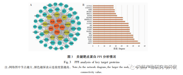 Par rapport à la pharmacologie traditionnelle, la pharmacologie des réseaux offre une nouvelle perspective pour le développement de nouveaux médicaments. Afin de mieux comprendre le mécanisme d'action de la glycyrrhizine sur le cancer de la prostate résistant à la castration, nous avons utilisé des méthodes de pharmacologie de réseau pour collecter 683 cibles de la glycyrrhizine dans des bases de données telles que TCMIO, TCMSP et PharmMapper. Nous avons obtenu 55 cibles clés de la glycyrrhizine pour le cancer de la prostate résistant à la castration en utilisant des outils de diagramme de Venn, et identifié 10 cibles principales telles que AKT1, TP53, ESR1, EGFR et ALB grâce à l'analyse du réseau d'interactions protéiques PPI. L'analyse d'enrichissement GO a montré que la glycyrrhizine régule principalement le métabolisme cellulaire et l'apoptose en régulant la phosphorylation des protéines, les réactions d'oxydation et le cycle cellulaire. L'amarrage moléculaire a également montré que la glycyrrhizine a une bonne activité d'amarrage avec 10 cibles principales. Il est prévu que la glycyrrhizine puisse avoir des effets antitumoraux en régulant l'expression de ces protéines cibles principales. Parmi ces cibles principales, la protéine AKT1 présente l'activité d'ancrage la plus élevée. AKT1 est l'un des facteurs régulateurs importants de la voie de signalisation PI3K/AKT, impliquée dans divers processus biologiques des tumeurs. Dans le cancer de la prostate, des variations génétiques et une dysrégulation de l'expression génétique des composants de la voie PI3K/AKT ont été détectées dans 42% de cancers de la prostate primaires et 100% d'échantillons de cancers de la prostate métastatiques, sur la base des profils génomiques et transcriptomiques. Les premières études ont suggéré que les sous-types AKT (AKT1, AKT2) pouvaient favoriser la transition du stade sensible aux androgènes au stade réfractaire aux hormones dans le cancer de la prostate. Sur la base de la recherche fondamentale sur le traitement des patients atteints de CPRC, des études ont rapporté que l'inhibition de l'AKT1/2 dans les modèles animaux de cancer de la prostate résistant à la castration a réduit de manière significative les métastases in vivo et in vitro. On peut constater que l'inhibition de l'expression de l'AKT1 peut améliorer le pronostic de survie des patients atteints de CPRC, et que les inhibiteurs de l'AKT1 peuvent constituer un traitement potentiel pour les patients atteints de CPRC. Notre étude suggère théoriquement que la glycyrrhizine peut être un inhibiteur de l'AKT1, mais la question de savoir si la glycyrrhizine peut devenir un inhibiteur efficace de l'AKT1 pour les patients atteints de CRPC doit encore faire l'objet d'une vérification expérimentale à l'avenir.