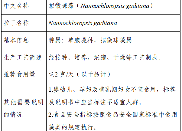 The production and use of new food ingredients should be in line with the content of the announcement and the requirements of food safety-related regulations. In view of Nannochloropsisgaditana (Nannochloropsis) in infants and young children, pregnant women and lactating women in the population of food safety information is insufficient, from the principle of risk prevention considerations, the above groups of people should not be consumed, labeling and instructions should be marked unsuitable for the population.
