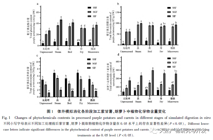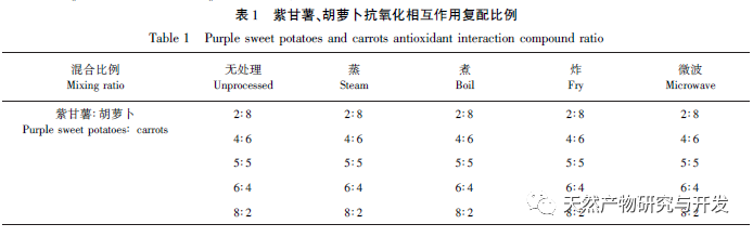 The main cooking methods for vegetables in China include stir frying, deep frying, boiling, steaming, etc. Among them, the oil content of stir frying and deep frying methods is generally high, while boiling and steaming methods can achieve low oil cooking. Different processing methods also have a certain impact on the phytochemicals contained in the diet. However, there are currently few reports on evaluating the phytochemicals and antioxidant activity of fruits and vegetables processed using different processing methods and compounded in different proportions. Relevant studies focus on the changes in phytochemical activity in fruits and vegetables before and after processing, and there are no reports on the compounding of processed fruit and vegetable extracts. This experiment treated purple sweet potatoes and carrots with different heat processing methods, and measured the content of phytochemicals in purple sweet potatoes and carrots before and after processing, as well as the in vitro antioxidant activity of extracts; Mix the extracts in different proportions and evaluate their antioxidant effects after compounding; By simulating digestion in vitro, the changes in phytochemical content and antioxidant activity at different stages of digestion were measured and analyzed, providing methods and ideas for exploring scientific dietary ratios.