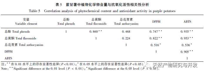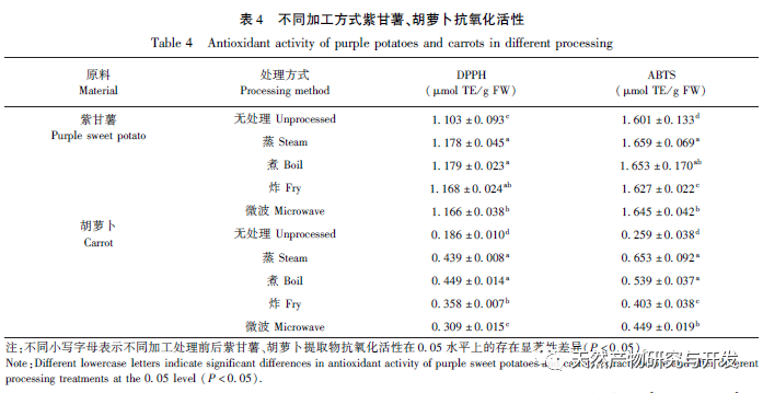 Purple sweet potatoes and carrots were processed using four methods: steaming, boiling, frying, and microwaving, and the changes in total phenols, total flavonoids, total anthocyanins, and total carotenoids content before and after treatment were measured. The results showed that steaming and boiling processing can effectively convert the bound phytochemicals in purple sweet potatoes and carrots into free states for human absorption and utilization, and the degradation degree of phytochemicals caused by steaming and boiling processing is relatively low compared to frying and microwave processing. At the same time, DPPH and ABTS methods were used to determine the antioxidant activity of steamed, boiled, fried, microwave treated and untreated purple sweet potatoes and carrots. It was found that steamed and boiled processed purple sweet potatoes and carrots had better antioxidant activity compared to other processing methods. Correlation analysis also showed that total phenols, total anthocyanins, and total carotenoids showed good positive correlations with DPPH and ABTS, indicating a good positive correlation between plant chemical content and its antioxidant activity.