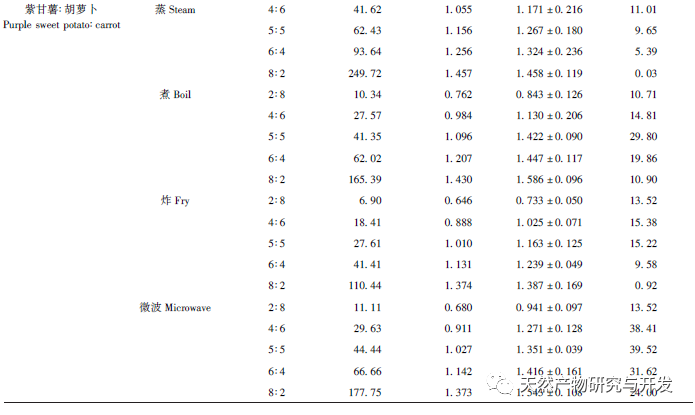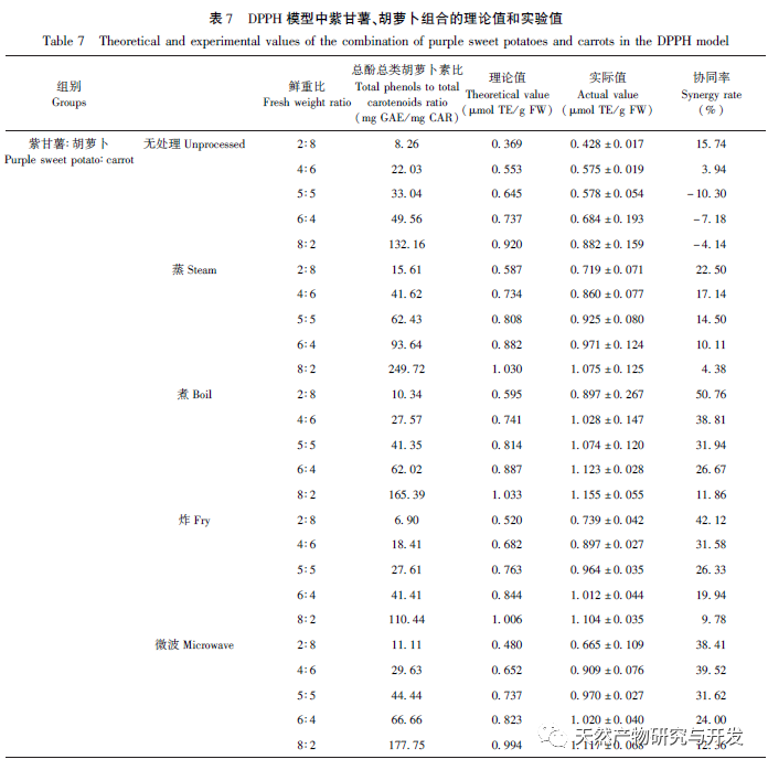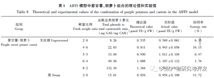 The purple sweet potato and carrot treated with the same method were compounded according to different fresh weight ratios, and the compounded combination showed significant antioxidant synergistic effects. In the DPPH group, when cooked and processed purple sweet potatoes were compounded with carrots in a ratio of 2:8, the synergistic rate reached its maximum (50.76%). In the ABTS group, the microwave 5:5 group had the highest antioxidant synergistic rate (39.52%), followed by the microwave 4:6 group (38.41%), while the steaming 8:2 group had the lowest antioxidant synergistic rate (0.03%). Overall, when the ratio of purple sweet potato to carrot is around 2:8 to 4:6 in terms of fresh weight, that is, when the carrot accounts for a larger mass, its antioxidant synergistic effect is the best. When the fresh weight ratio is converted to the content of water-soluble and fat soluble phytochemicals for the ratio, the overall antioxidant synergistic effect can be significantly demonstrated when the proportion of water-soluble phytochemicals is higher.